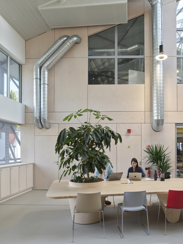 The materials used in the renovation, such as glass and metal, also reflect this heritage. The floors are new, with industrial concrete slabs. The renovation of the industrial building is rooted in its industrial history and preserves its codes.