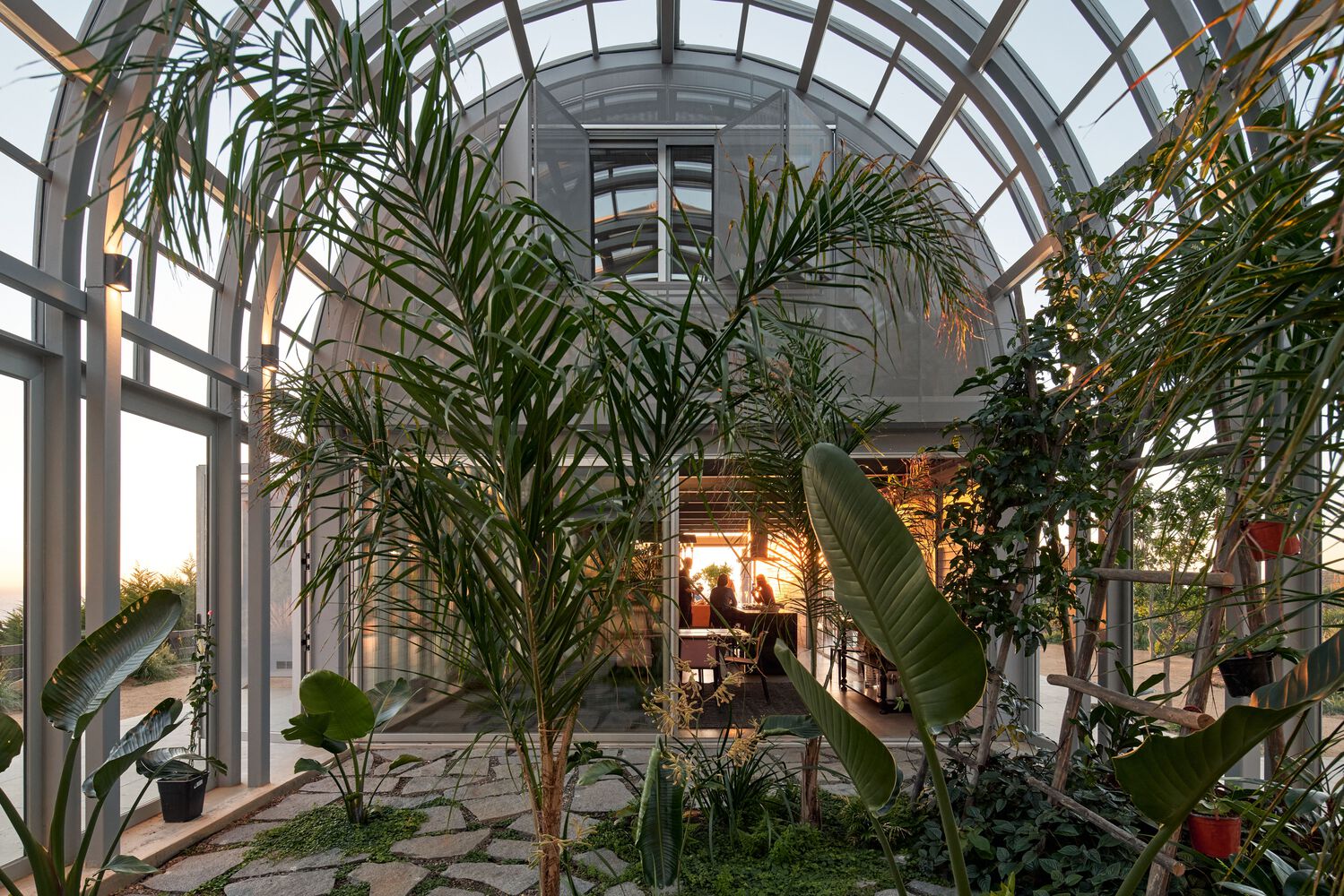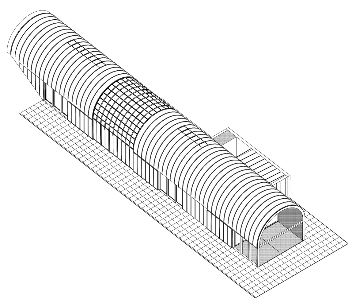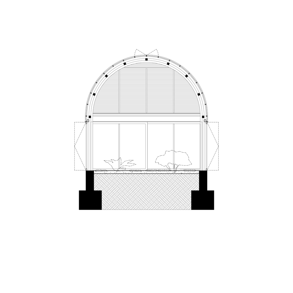 고대 반원형 아치에서 영감을 받은 볼트 구조는 연중 온화한 기후를 제공하는 최대 볼륨의 블록을 통합한다. 이 구조는 고대 형태뿐만 아니라 원래 채소밭이 있던 자리에 새로운 온실의 형태를 띤다. 이 건물의 모든 마감재에는 농업 산업적 미학이 적용되었고, 주거 프로그램의 요구를 충족시키는 세심함이 요구되었다. 돔 지붕은 이러한 분위기를 배가시킨다. 돔 지붕은 이러한 분위기를 배가시킨다.