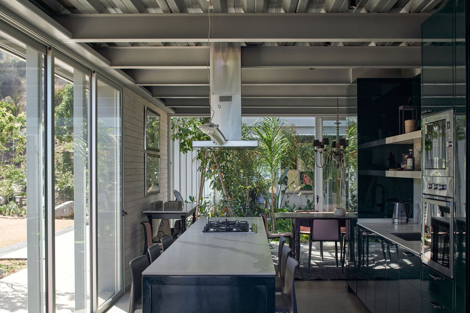 The vaulted structure – analogous to ancient semi-circular arches – integrates within a maximum volume of temperate climate – year-round – blocks of the compact program. It refers to archaic forms, as well as to that of a new greenhouse that takes the place where there used to be a vegetable garden. This agro-industrial (and economic) aesthetic is applied to all the finishes of the building, worked with the care required by a residential program.