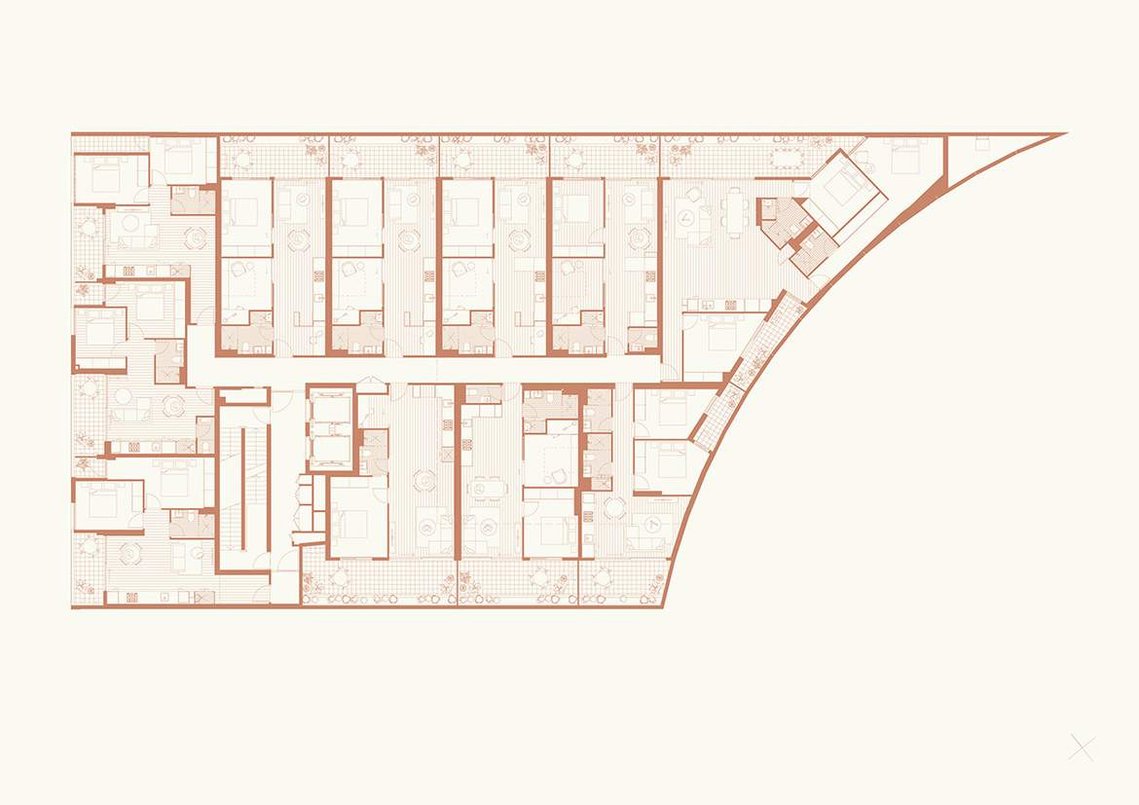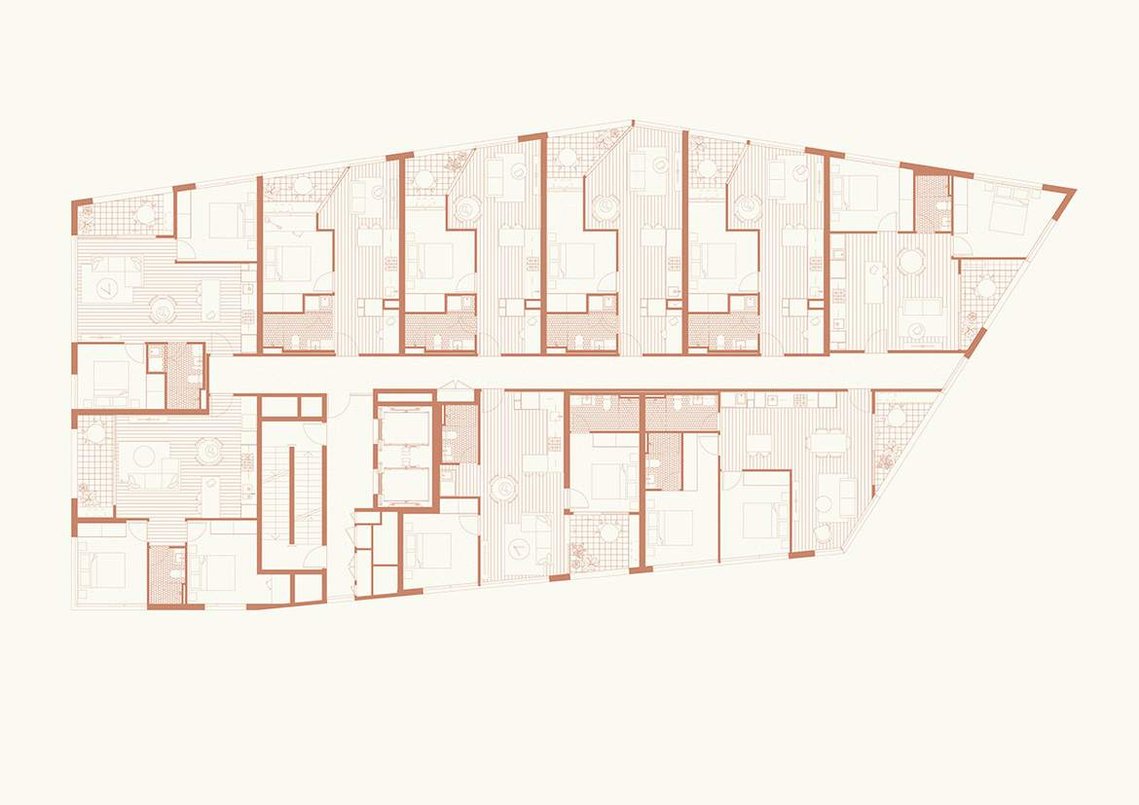 The 83 unit, 12 storey multi-residential building takes the form of a ‘lozenge’ in order to maximize views and natural light, and includes a 238 sqm communal terrace.