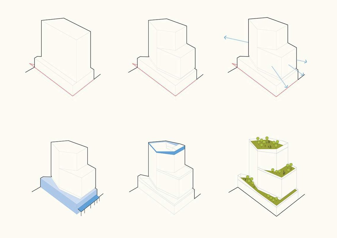 2. 포디엄: 두 층으로 된 포디엄은 주변 창고 유형을 미묘하게 참고하여, 현대 디자인과 역사적 요소를 혼합합니다.