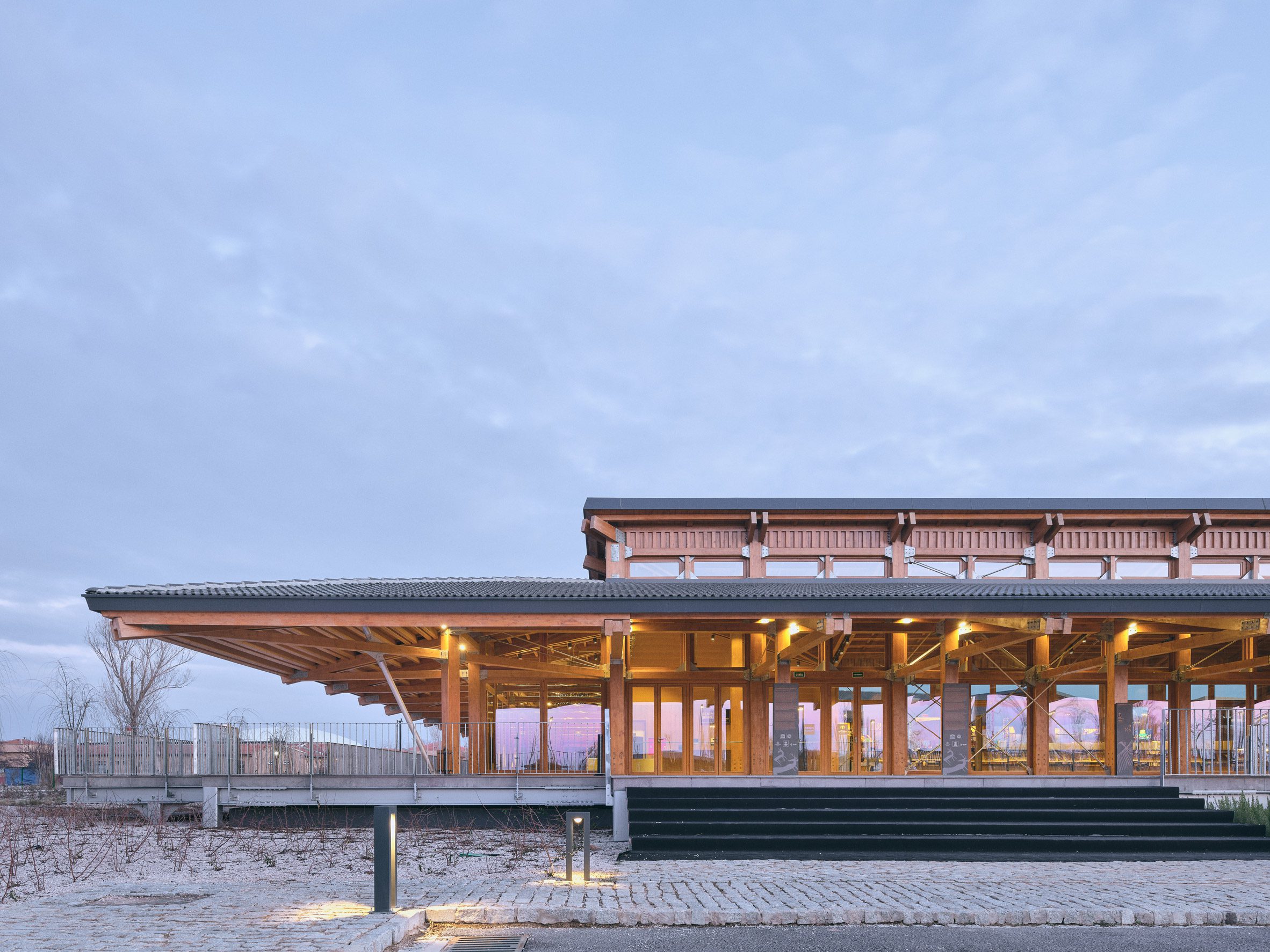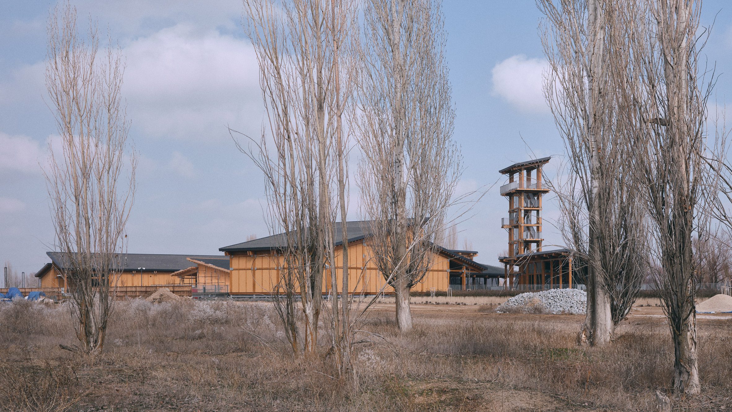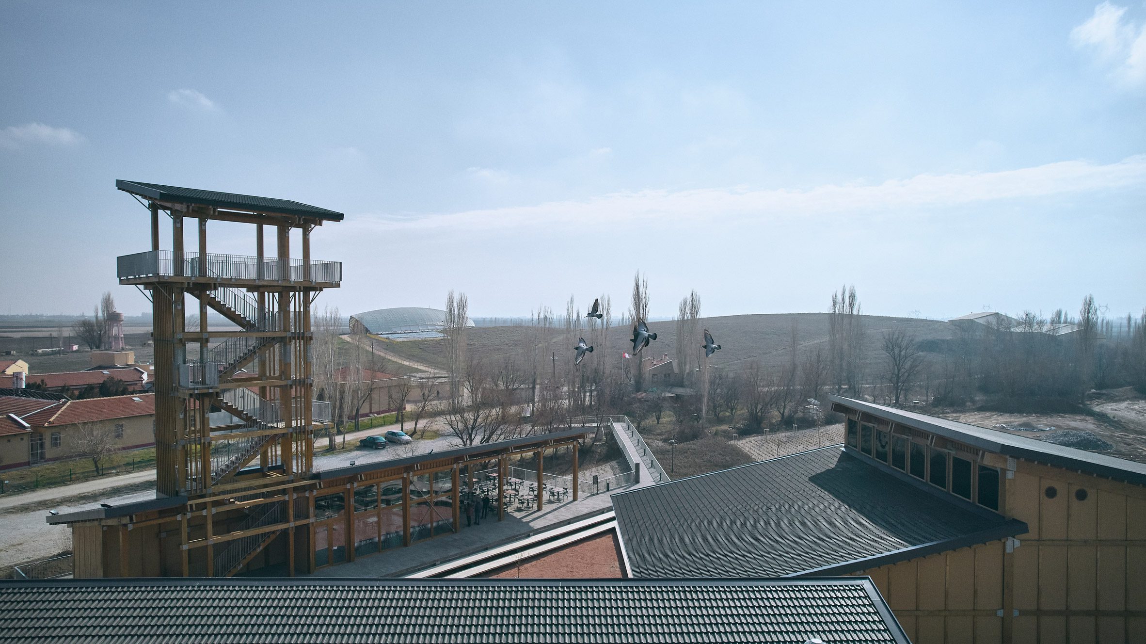 To the east, a 22-metre high wooden tower rises above the centre to provide visitors with views over the two archaeological mounds of the ancient settlement and across the adjacent plains.