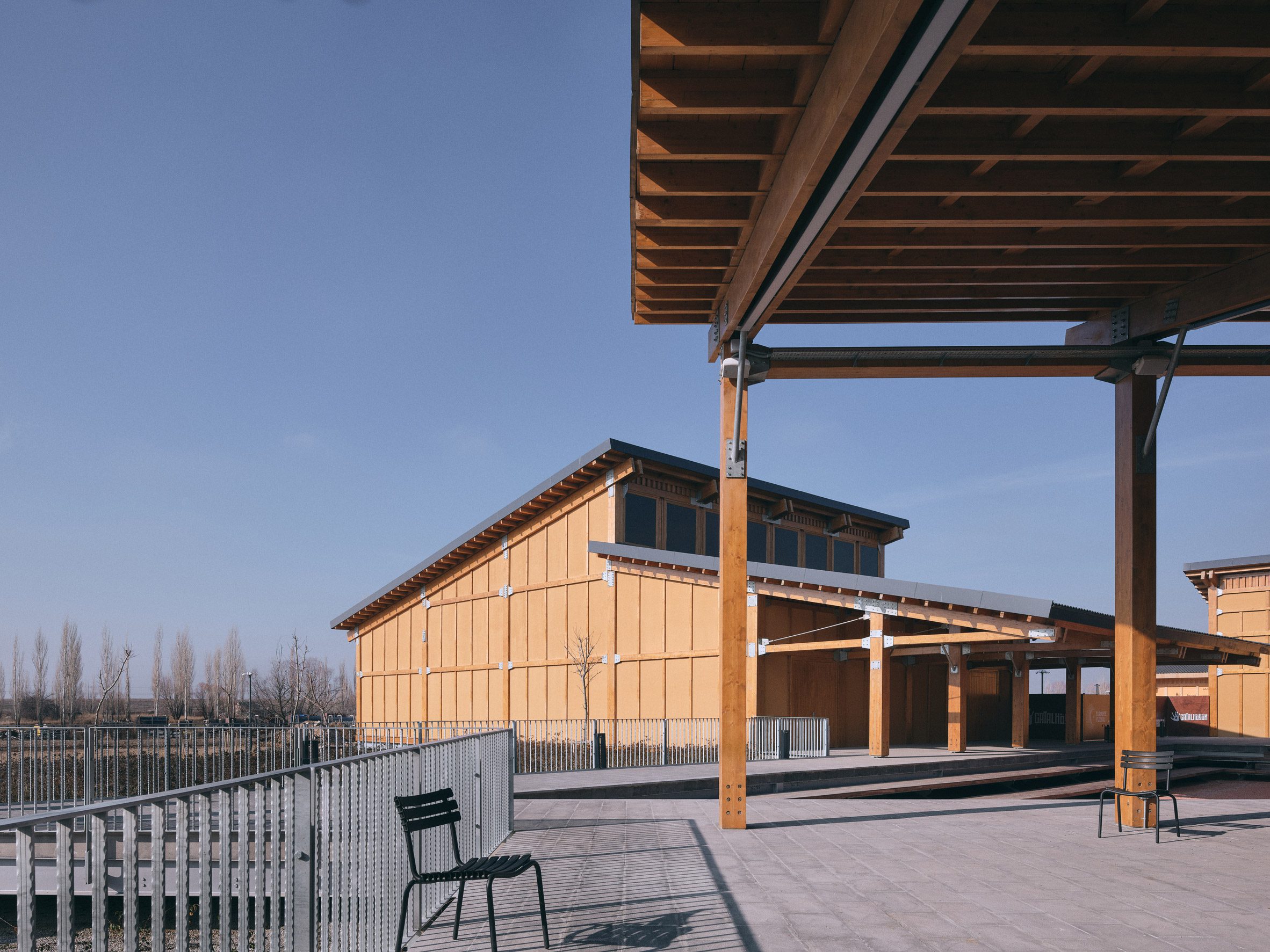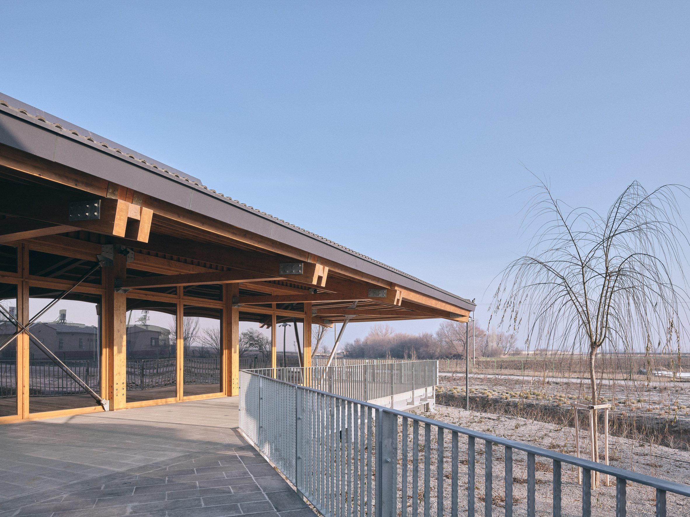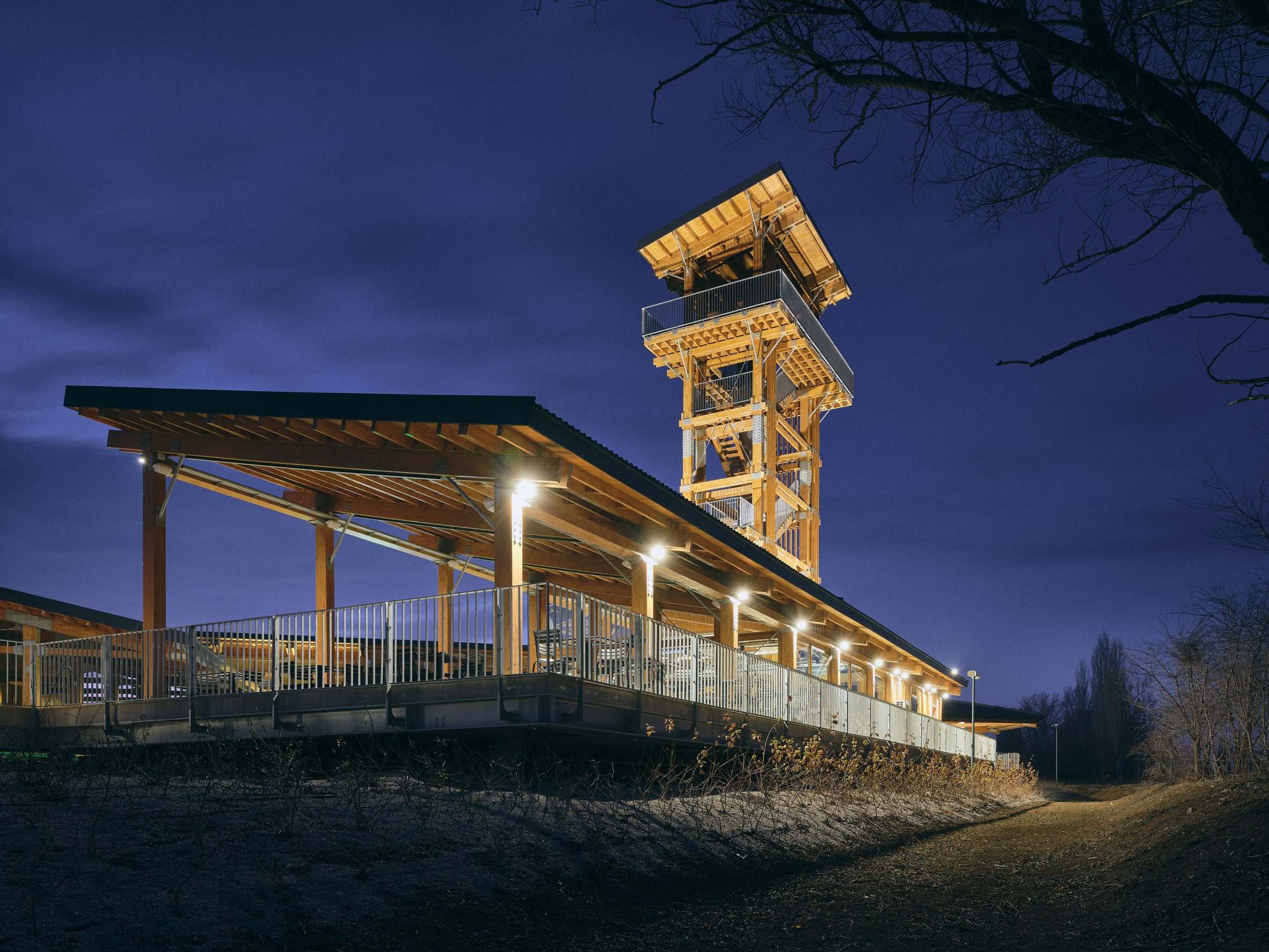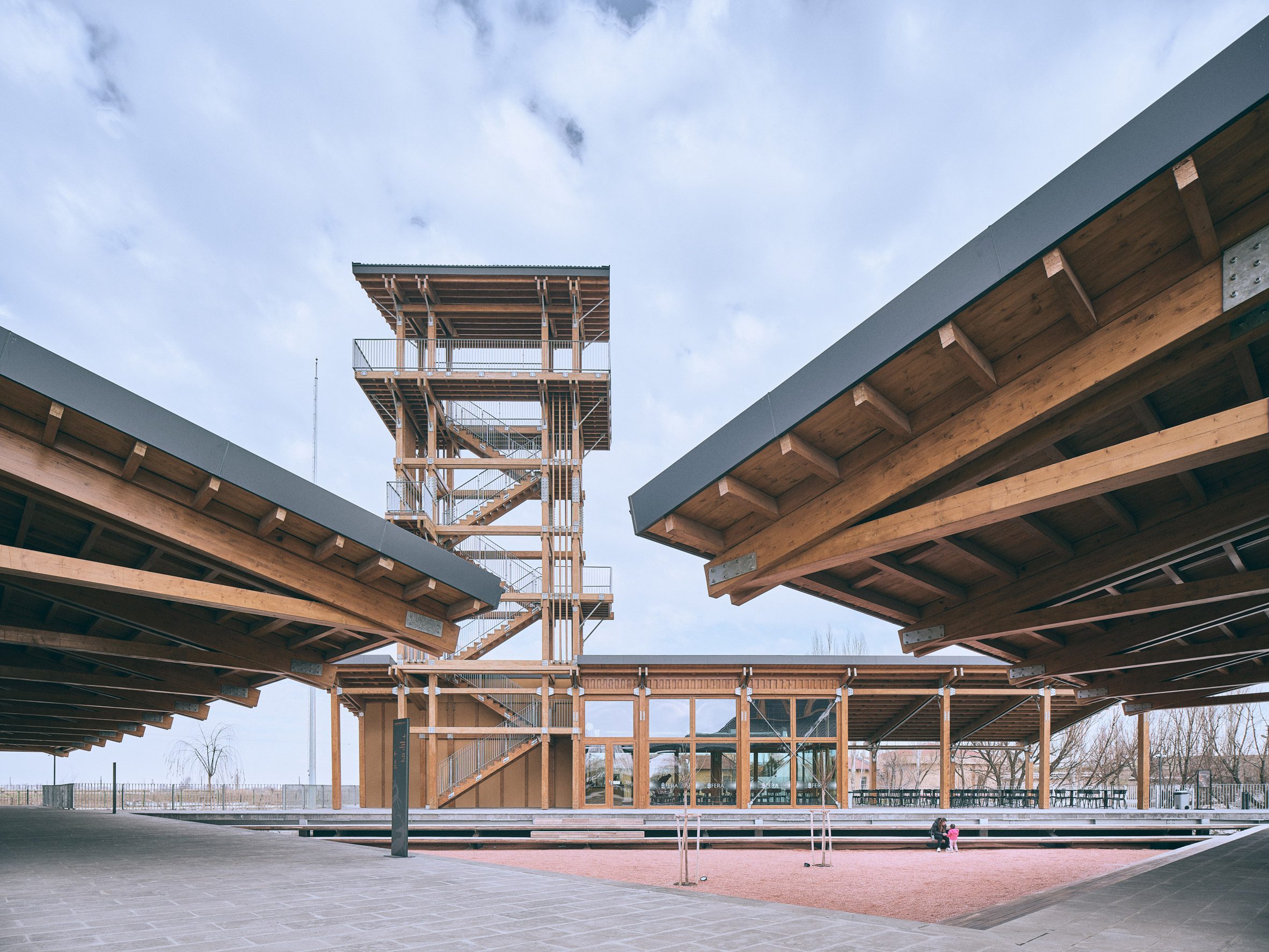 To the east, a 22-metre high wooden tower rises above the centre to provide visitors with views over the two archaeological mounds of the ancient settlement and across the adjacent plains.