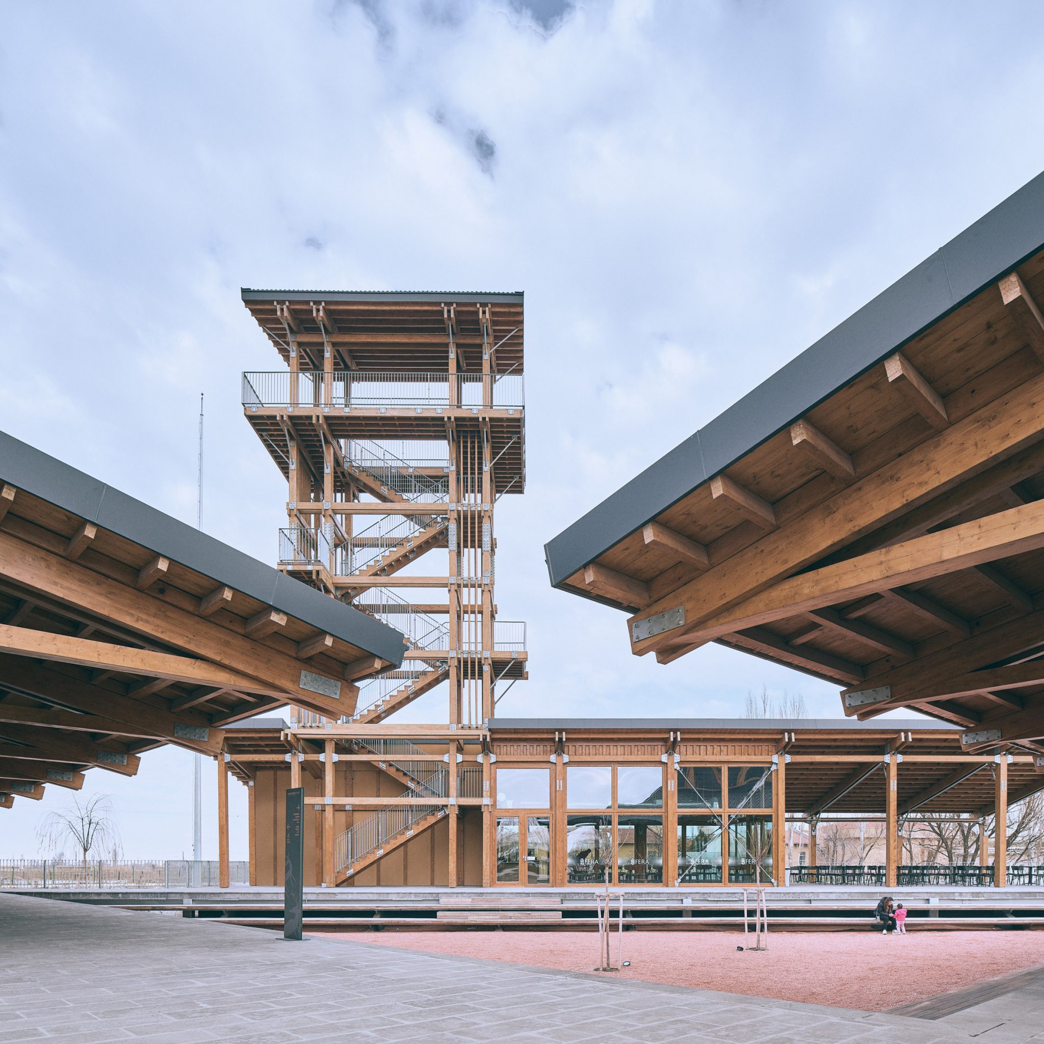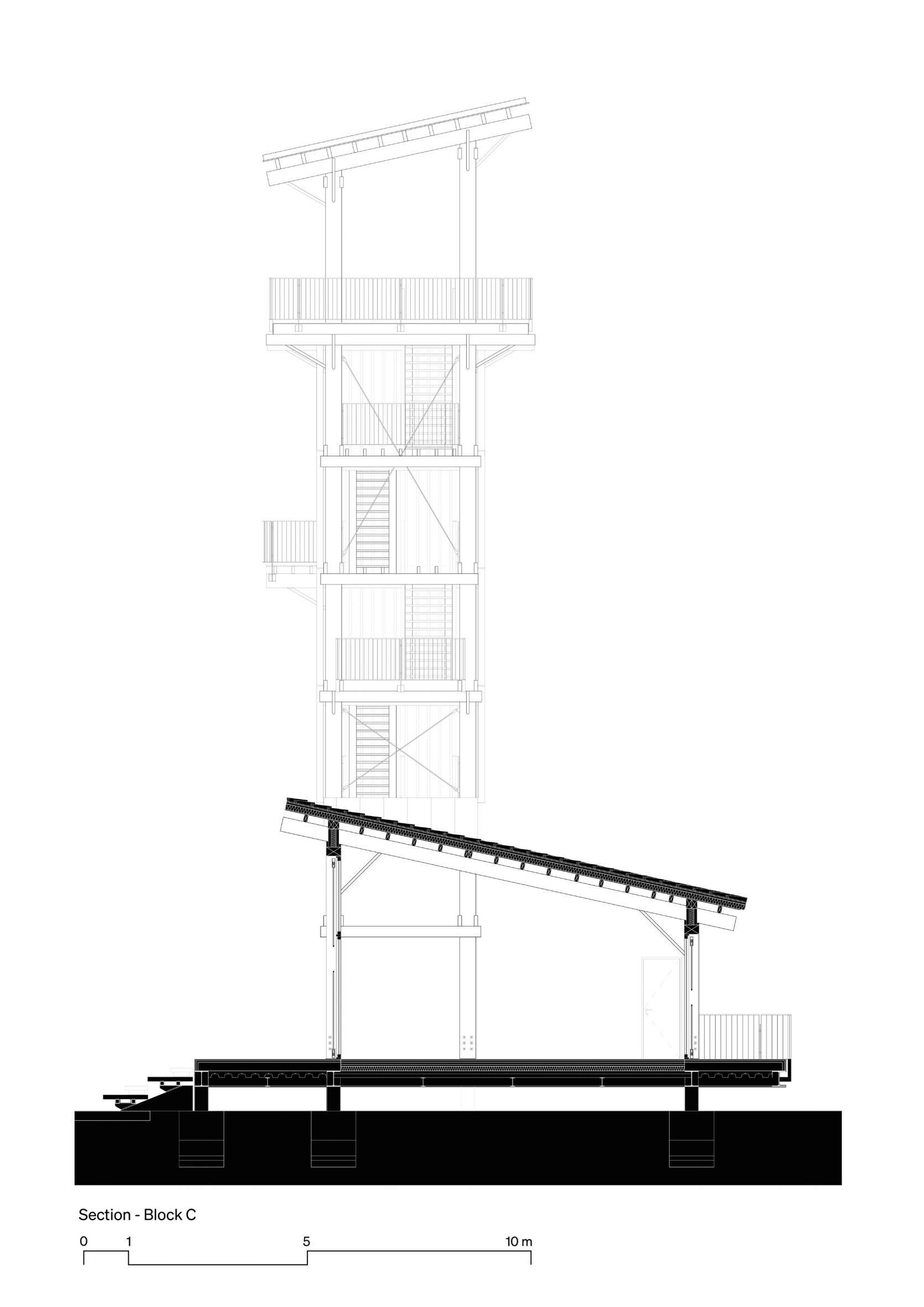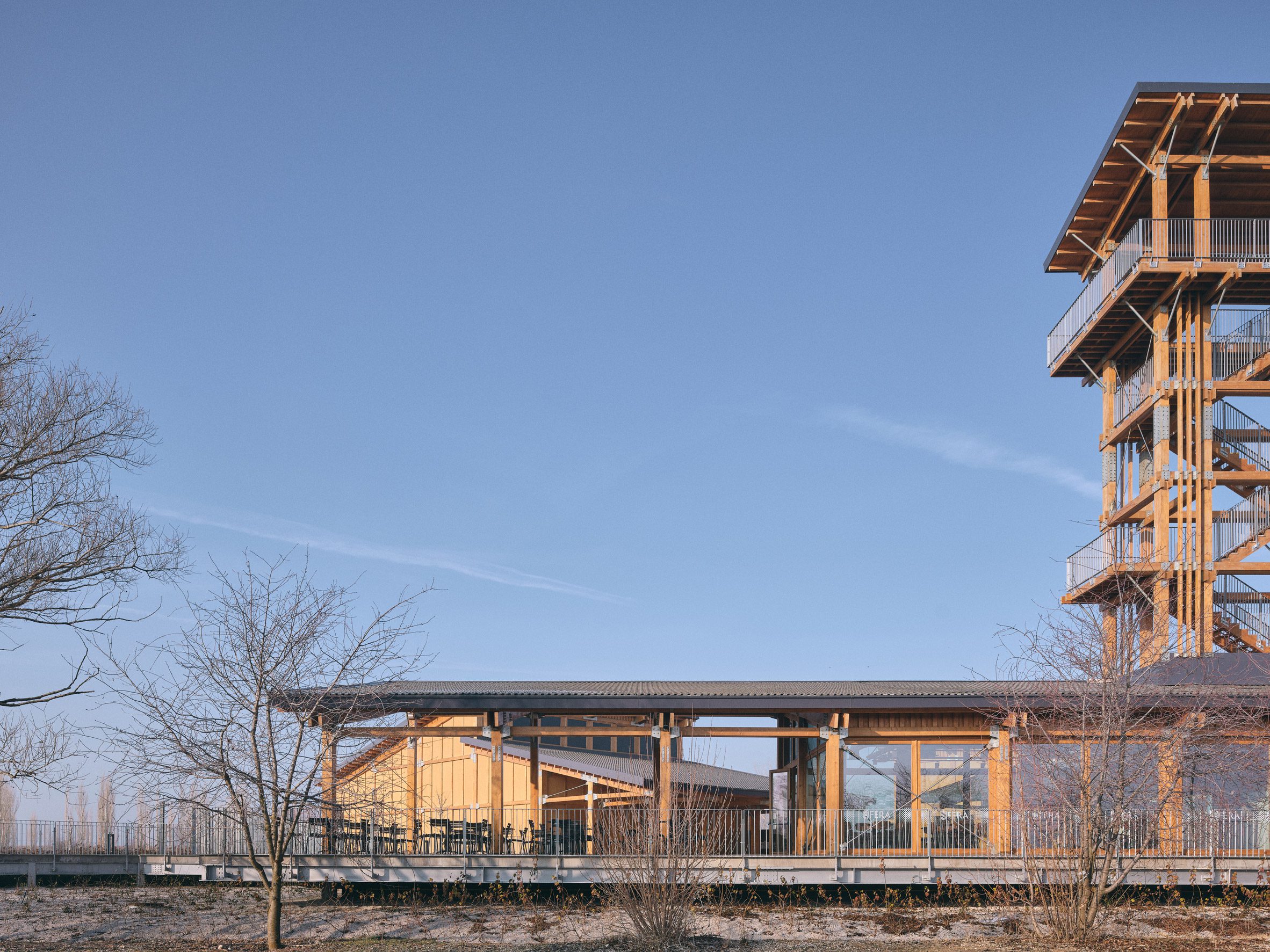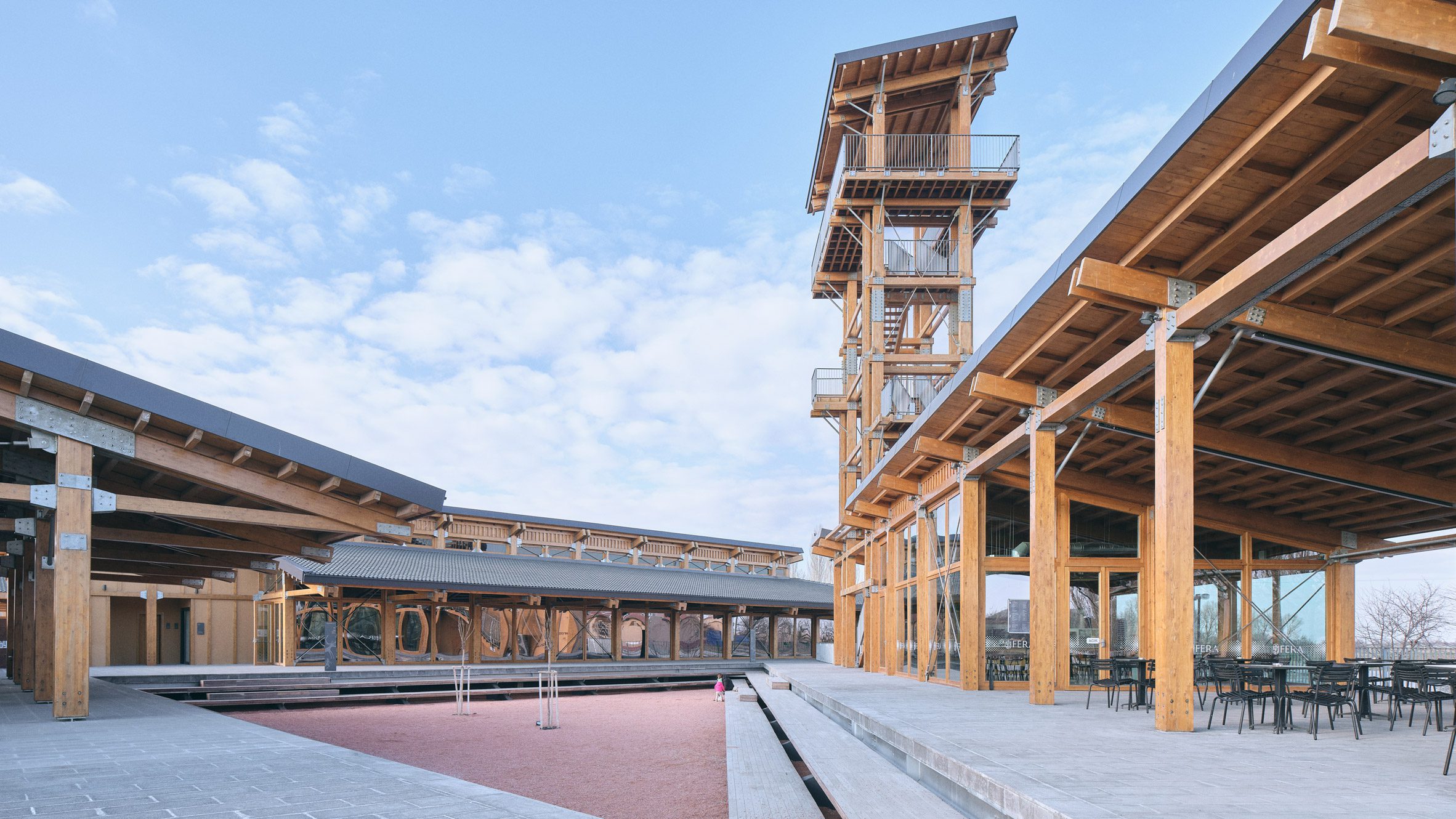 At its base, a wrap around terrace on the ground floor hosts a visitor cafe, with visual connections to the other buildings through the timber-framed glass windows and doors.