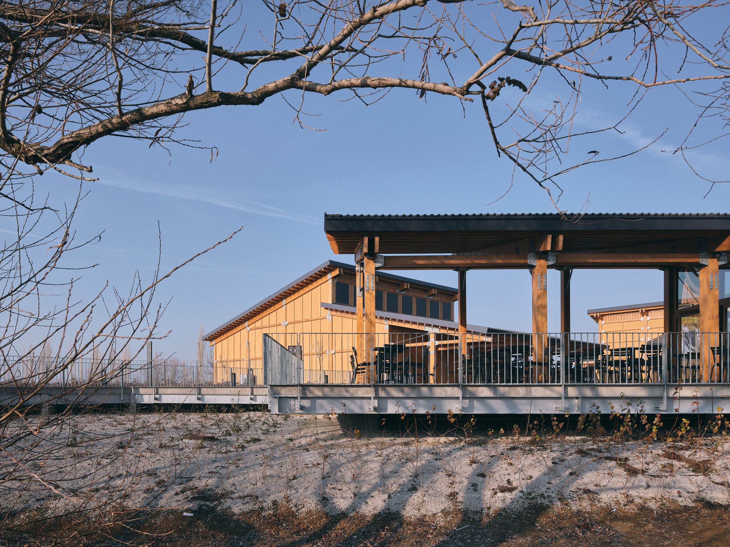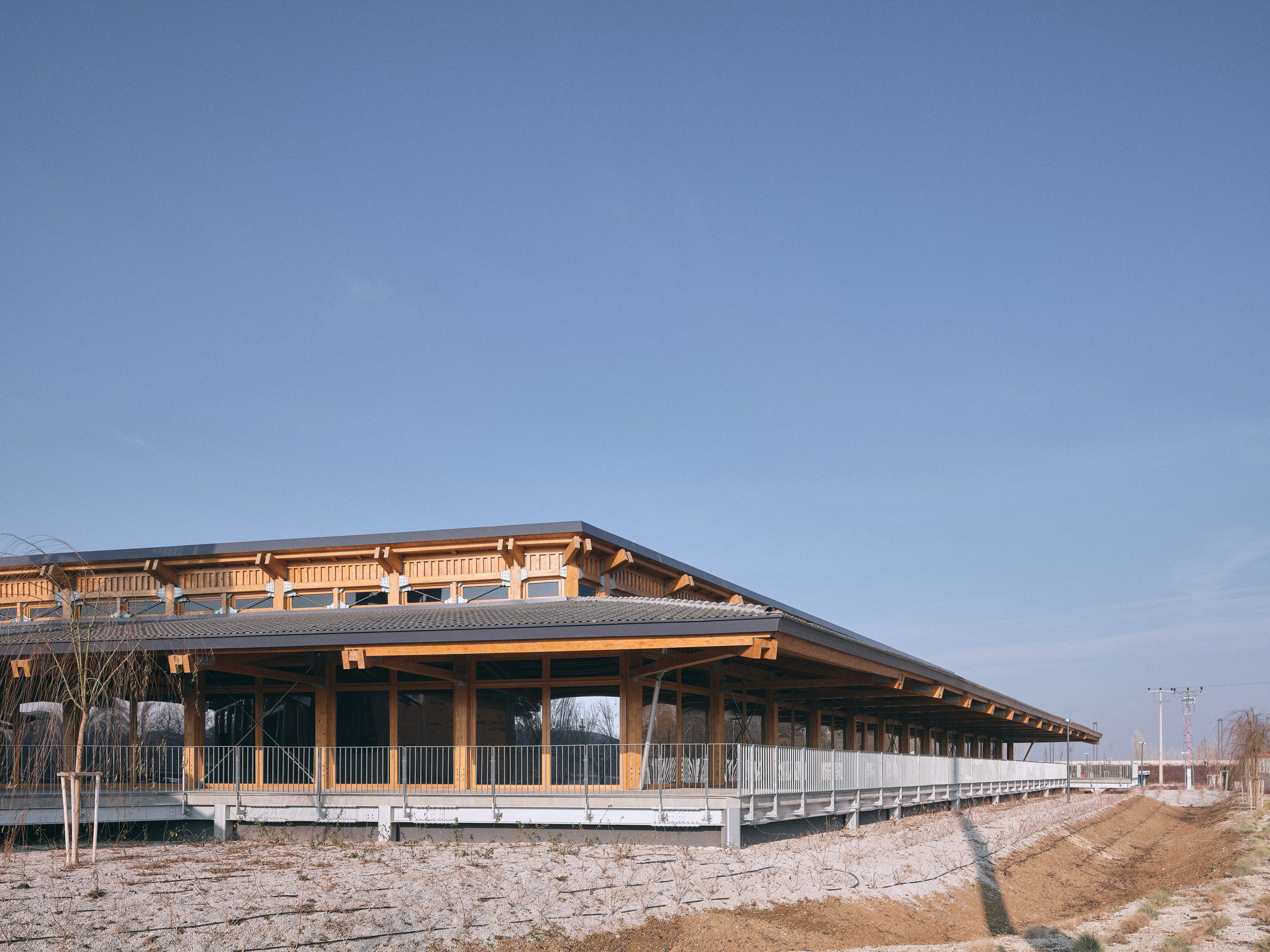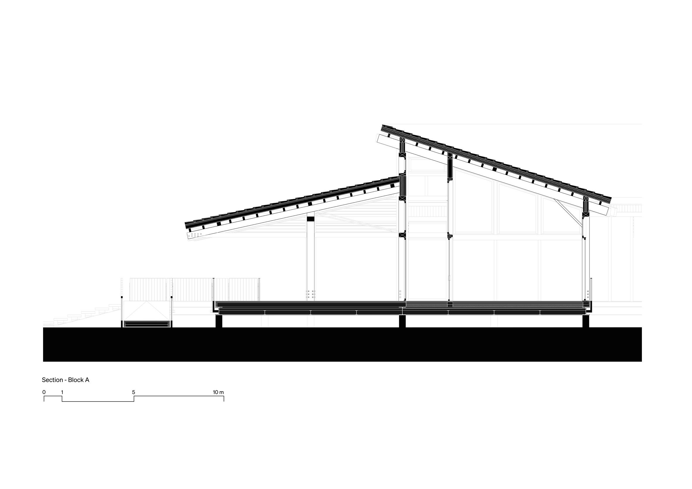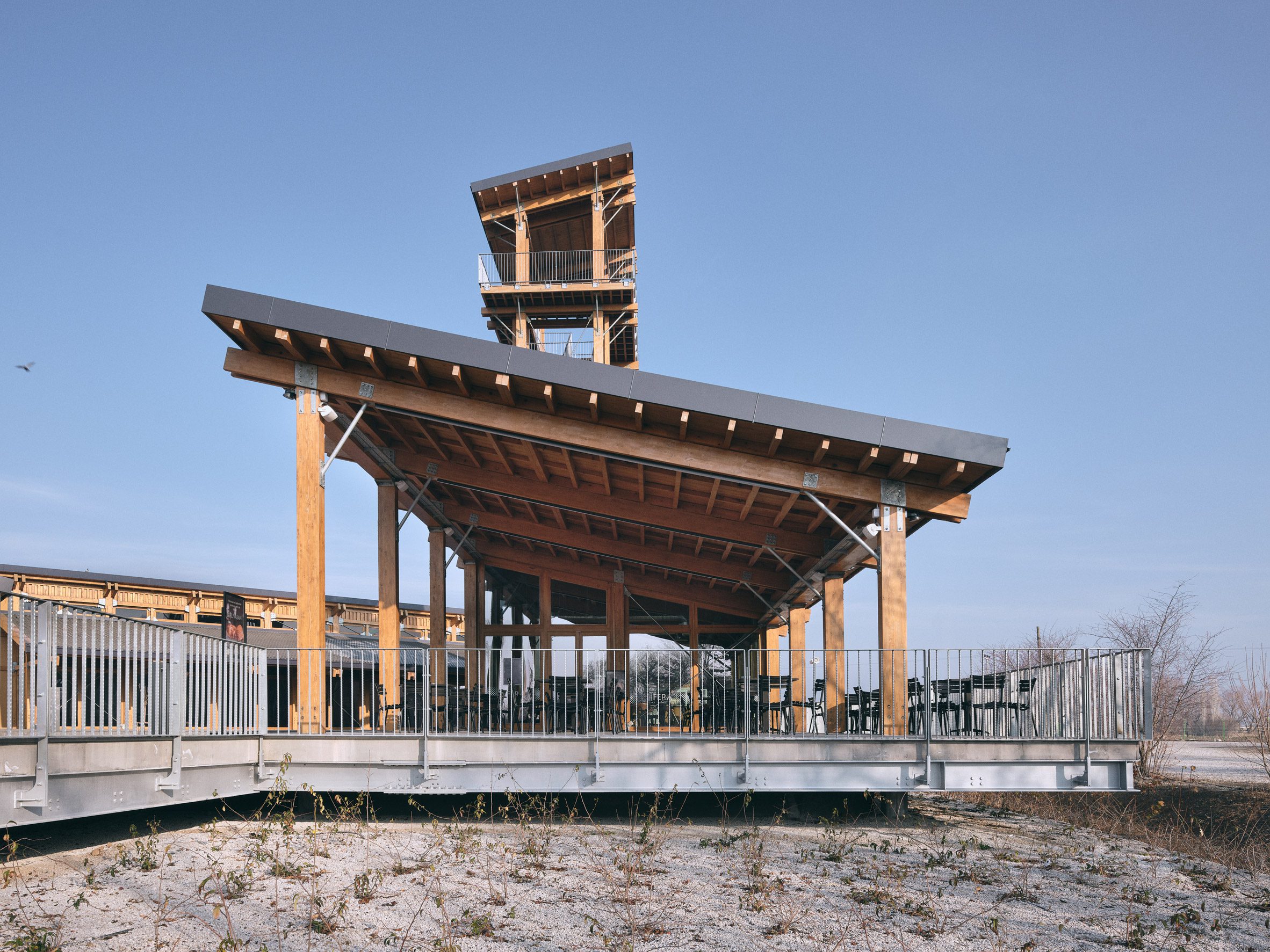 At its base, a wrap around terrace on the ground floor hosts a visitor cafe, with visual connections to the other buildings through the timber-framed glass windows and doors.
