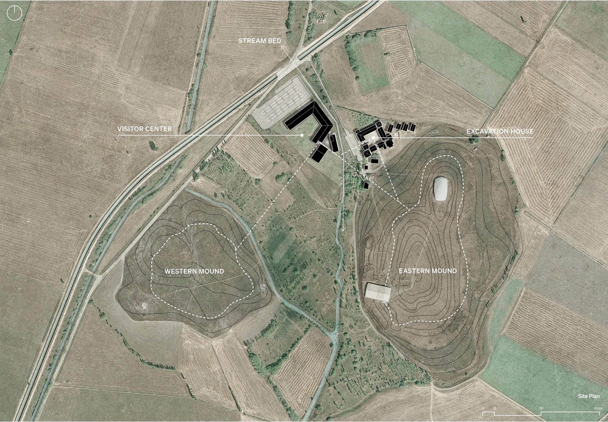 건물들은 고대 유적지에 대한 영향을 최소화하기 위해 지상에서 1미터 높이로 얇은 콘크리트 기초 위에 세워졌다. 경량 목재 사용은 고대 역사와 대조를 이루며 지면 방해를 최소화한다.