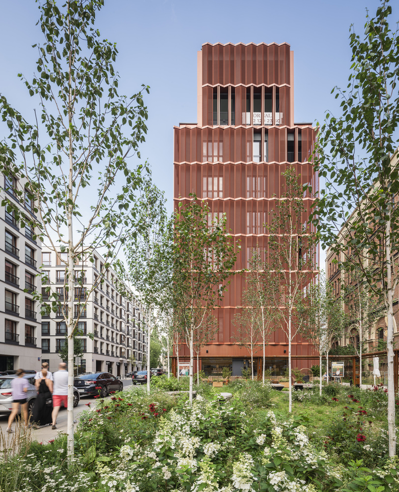건물은 바르샤바 양조장 단지의 중심에 위치하여 주요 공공 공간들을 연결하는 거울 패널 통로를 제공합니다. 1층에는 상업 시설이 있으며, 아늑한 도시 광장, 녹지 광장, 예술가를 위한 공간이 있는 중앙 광장 등 세 가지 구별된 광장이 있습니다. 건물 주변의 공공 공간들은 도시적인 특성을 강화하고, 주민과 방문객들에게 공동의 공간을 제공합니다.
