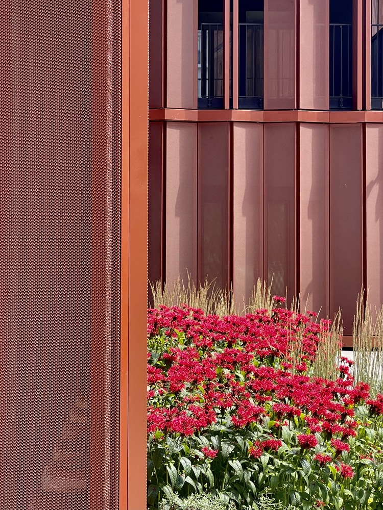 구리색 이동식 셔터 패널이 특징인 외관은 역동적이고 반짝이는 효과를 내며, 주민들이 사생활과 빛을 조절할 수 있게 합니다. 이는 끊임없이 변화하는 외관을 만들어냅니다. 건물의 구조는 산업 유산을 반영하여 남쪽에서 recessed outline을 반복하고, 다른 측면에서는 좁아진 외관을 채택했습니다.