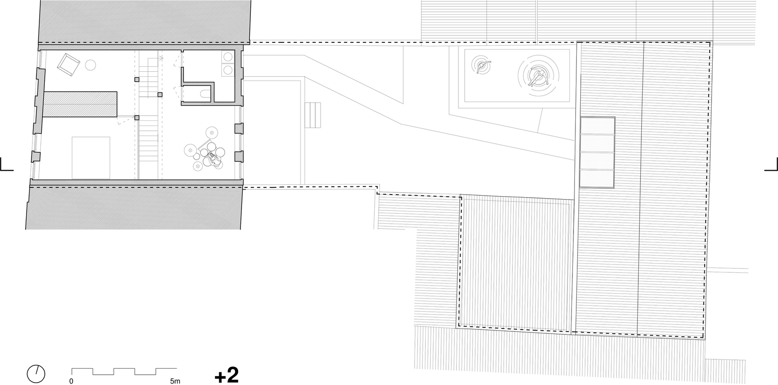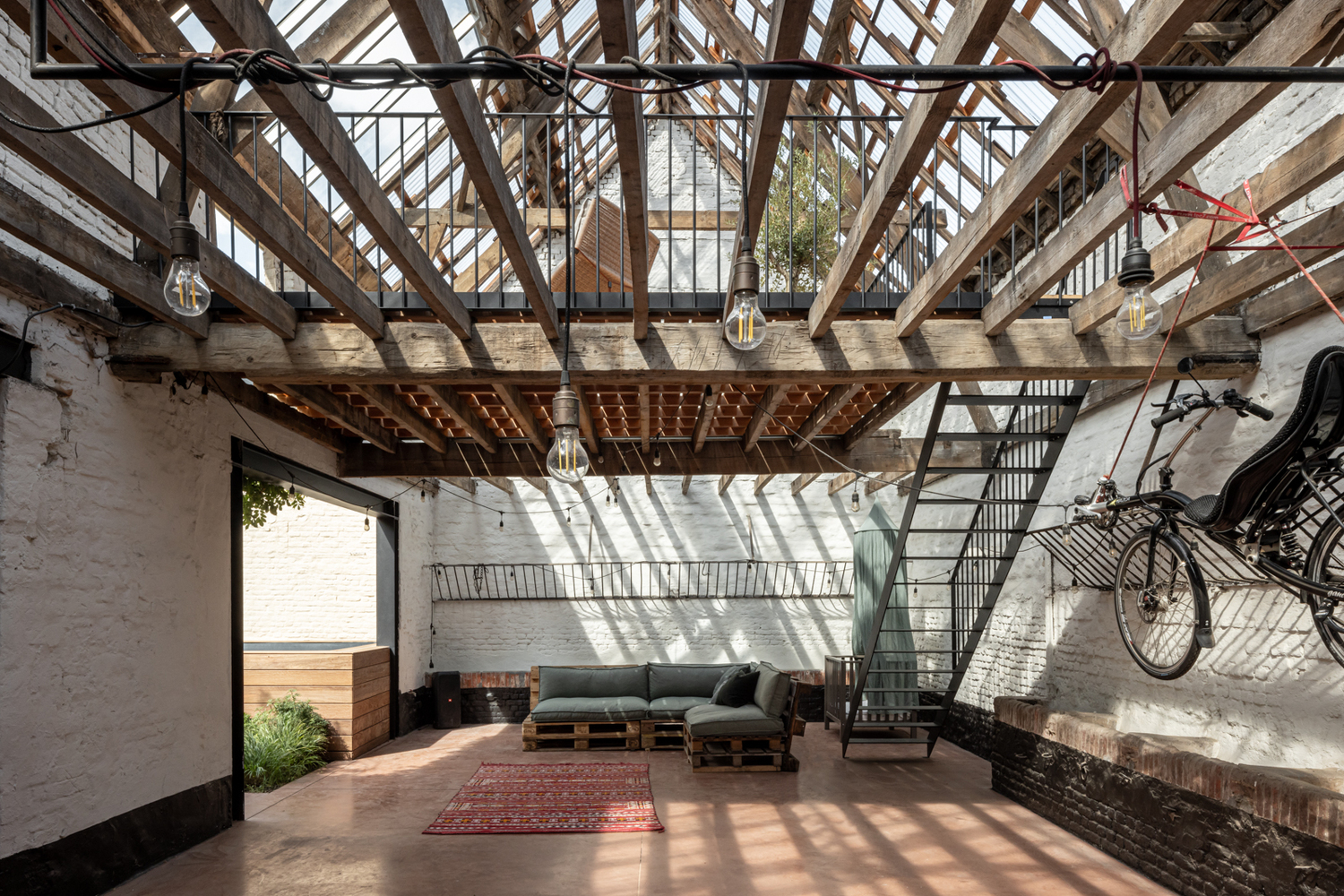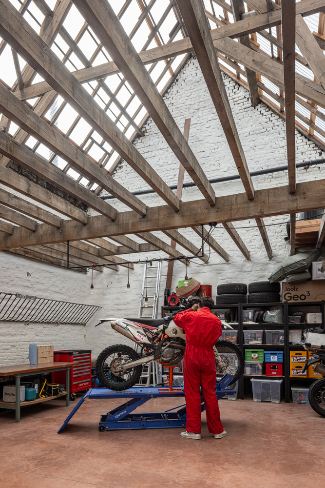 The stable was a very dark building, but by removing part of the floors and replacing the old roof covering with transparent corrugated sheets, light now enters generously and the beautiful beam structure creates a fascinating shadowplay. The space feels like a logical extension of the garden and is divided into a seating area and a workspace where Miel maintains his motorcycles. A staircase takes you to a platform where you can sunbathe under a sliding conservatory window.