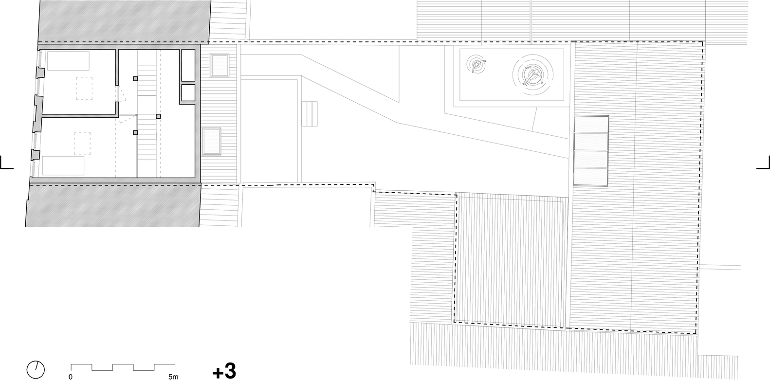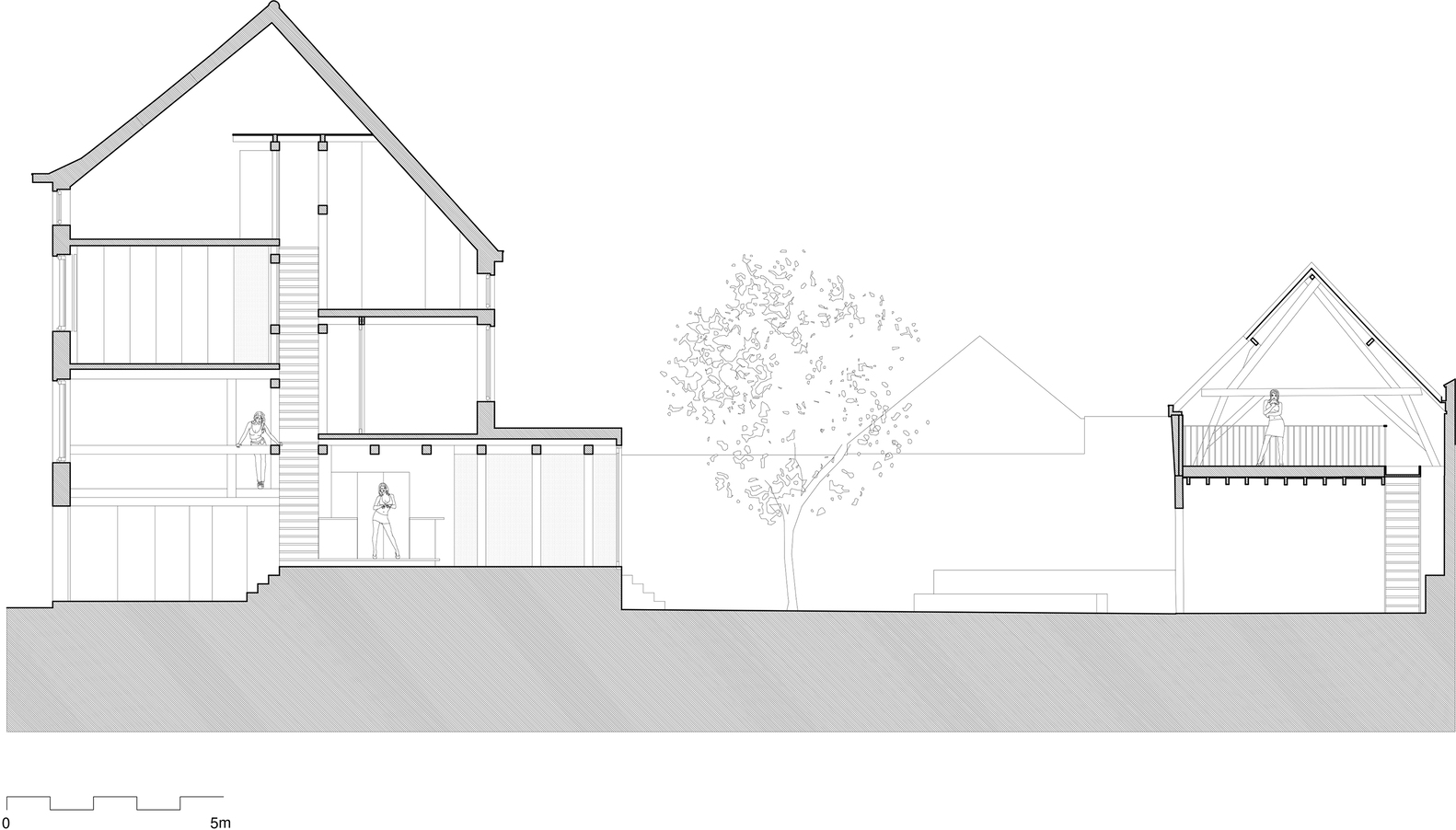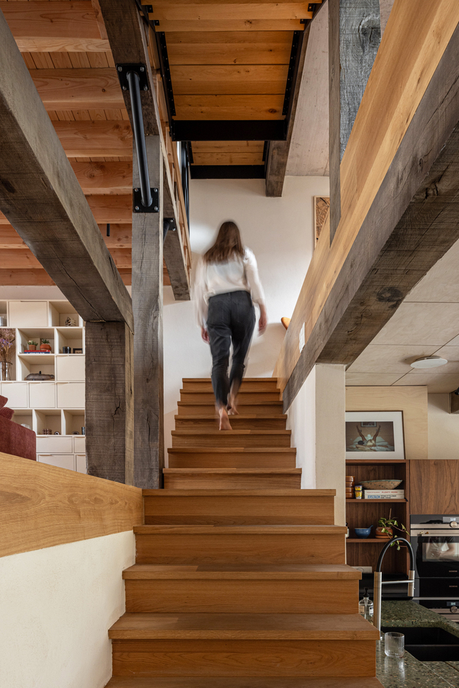 정원을 최대화하고 빛의 방향을 최적화하기 위해 스플릿 레벨 구조를 적용했다. 중앙 계단은 참나무 빔으로 둘러싸여 있으며, 모든 층을 연결해준다.