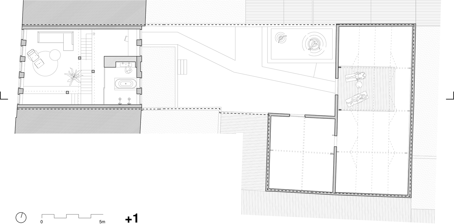 The house itself was in poor condition and the layout was impractical. A renovation would be so drastic that it was decided to rebuild. One of the challenges was to preserve the former atmosphere of the stable and to link it to the house together with the intermediate garden. The beam structure of the roof of the stable is impressive and at the same time feels very familiar, which is why it was decided to extend this feeling to the house.