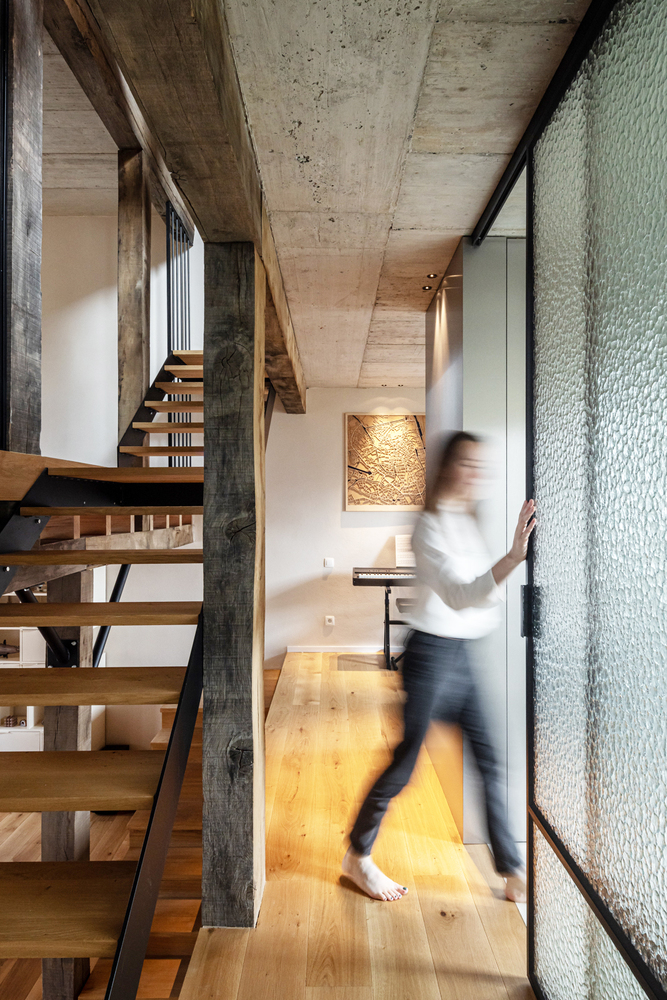 The staircase in the middle of the house, surrounded by oak beams as a wink to the stable, connects all split levels and provides a beautiful spatial experience and maximum views. Wherever you stand, you always see a window and feel the sunlight. This makes the house feel very light and spacious, and the residents can maintain contact with each other from every floor. Although the stairs and beam structure are very present, the choice of color and materials provides the desired tranquility. On each floor, you get a repetition of the same materials: oak, steel, (poly)concrete, loam, and stainless steel.