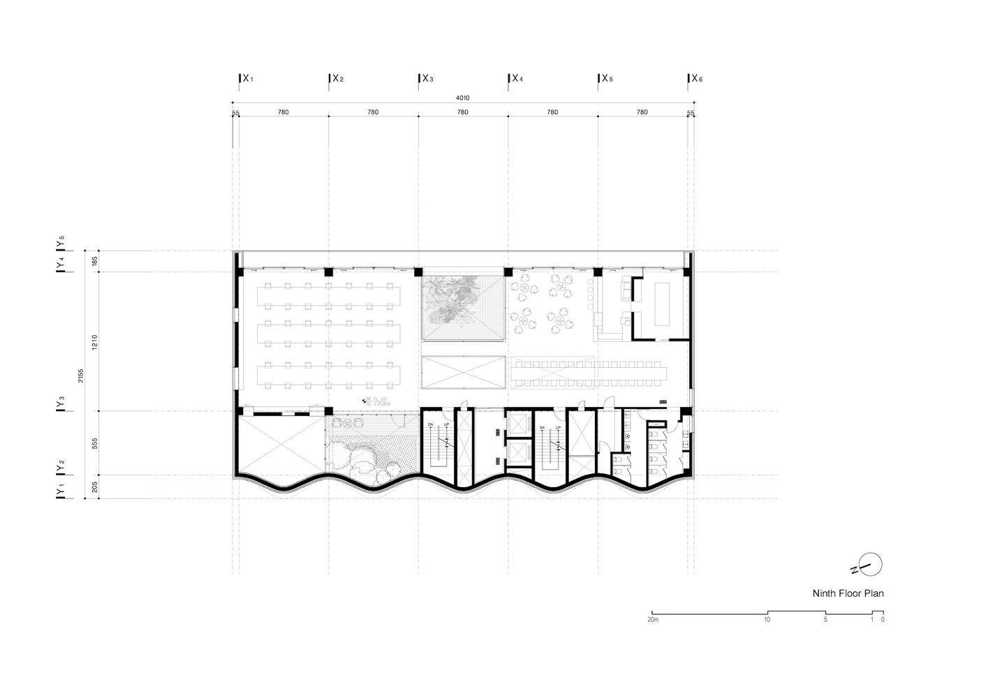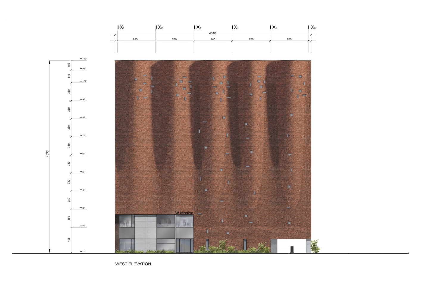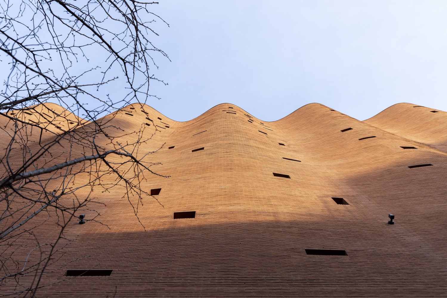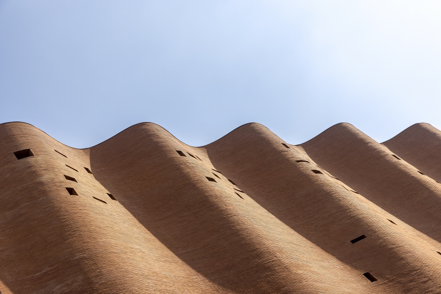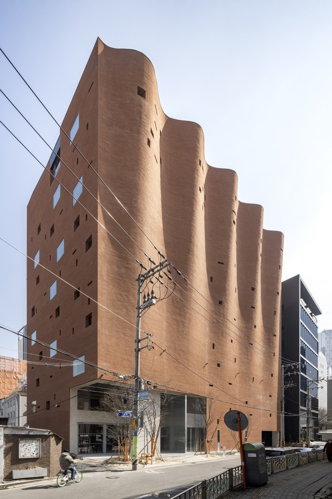 The reproduction of drapery in stone sculpture, as researched during the design process of the Administrative Building for the Textilverband, has always represented a captivating paradox. In this case, the traditional brick masonry system offered great capacity to depict and adapt to the desired curve. Brick construction has a long historical tradition in Seoul. The adopted solution, in this case, is a literal ‘curtain wall’ system using bricks attached to a concrete wall cast “in situ,” which serves as a guide for constructing the curve. With the help of a digital computational tool, we could devise a rather simple algorithm for creating the intended wave effect rising up to the sky. With 520 courses of brick height, every 24 courses, a new brick is added to achieve the desired curve growth. The wave amplitude ranges from 0 on the third floor, where it starts, to 170cm at the roof line.