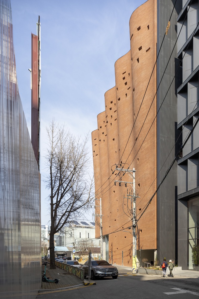 건물의 물결치는 파사드는 성수동 지역의 도시 전망을 위한 배경 역할을 합니다. 건물의 설계는 주변 환경과 통합되어 각 파사드에서 독특한 경험을 제공합니다.