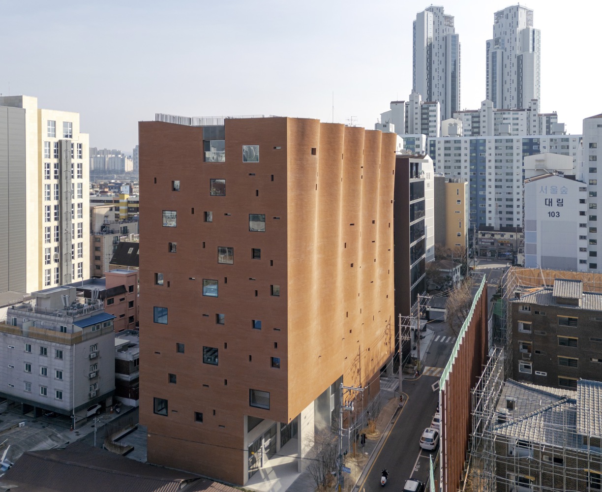 The waving façade acts as a backcloth for the urban perspectives of the streets that lead into Seongsu dong District from the west across the Seoul Forest Park. This characteristic solid façade houses the service program and the vertical circulations. In contrast, the outdoor gardens and terraces on the east façade offer a wide open view towards the Han River and Seongsu-dong District. The north façade is composed of apparently random openings categorized by three different types that respond to the programmatic requirements of the space.