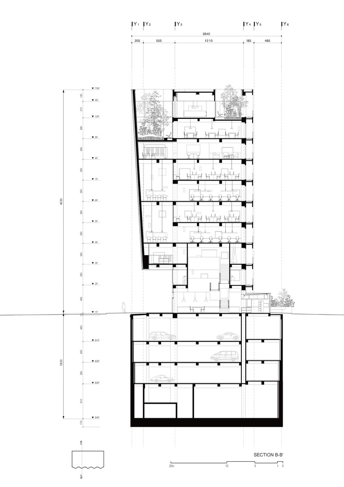 The building consists of 3 stratified programmatic layers: