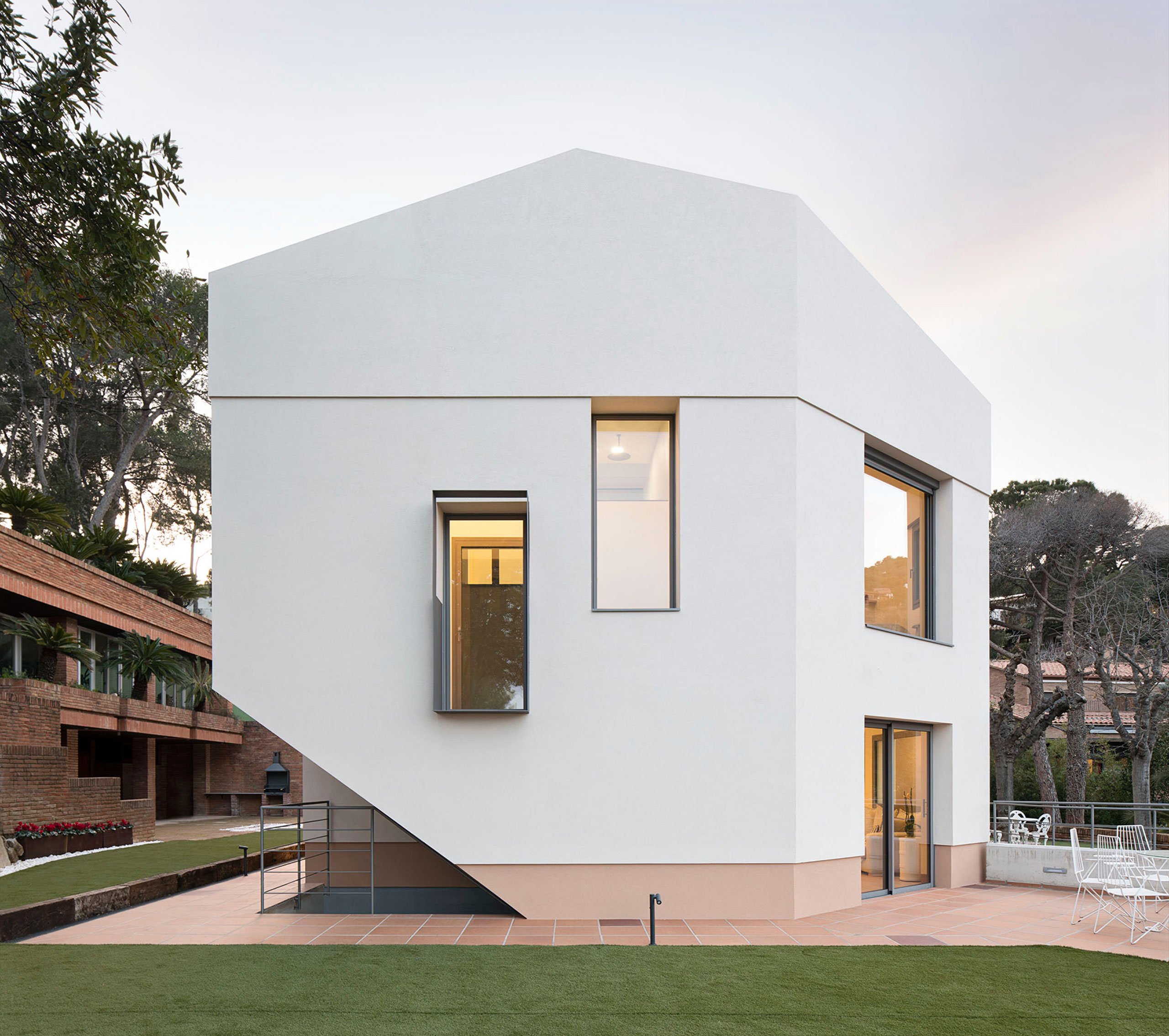 Located in Premià de Dalt, Spain, a hillside town a half-an-hour’s drive from Barcelona, this family residence by Madrid-based architect Pablo Corroto Pradillo caught our eye thanks to its sculptural rigour and understated refinement. Nestled against a backdrop of tall pines, the house’s whitewashed polygonal volume makes for a bold architectural statement amid its suburban surroundings. A series of smaller and larger rectangular and arched openings punctuating its monolithic mass further enhance its playful geometry.
