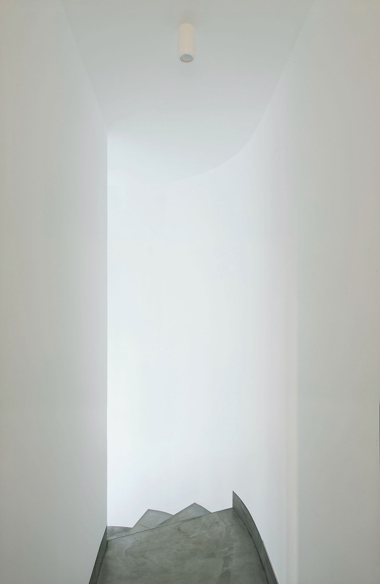 The architecture’s sculptural sensibility is matched by the soulful minimalism of interior design which is underpinned by a muted colour palette and plain materials. White surfaces dominate, imbuing the spaces with a soothing ambience, with hardwood floors adding warmth and raw concrete accents providing playful glimpses of the building’s underlying structure. The interior’s ascetic sensibility makes for a contemplative living environment. As the architect explains, “to fully appreciate this project, it is desirable to move through it, to invest a little time”. It seems that this home is not just a place to live, but a space to truly experience and savour.