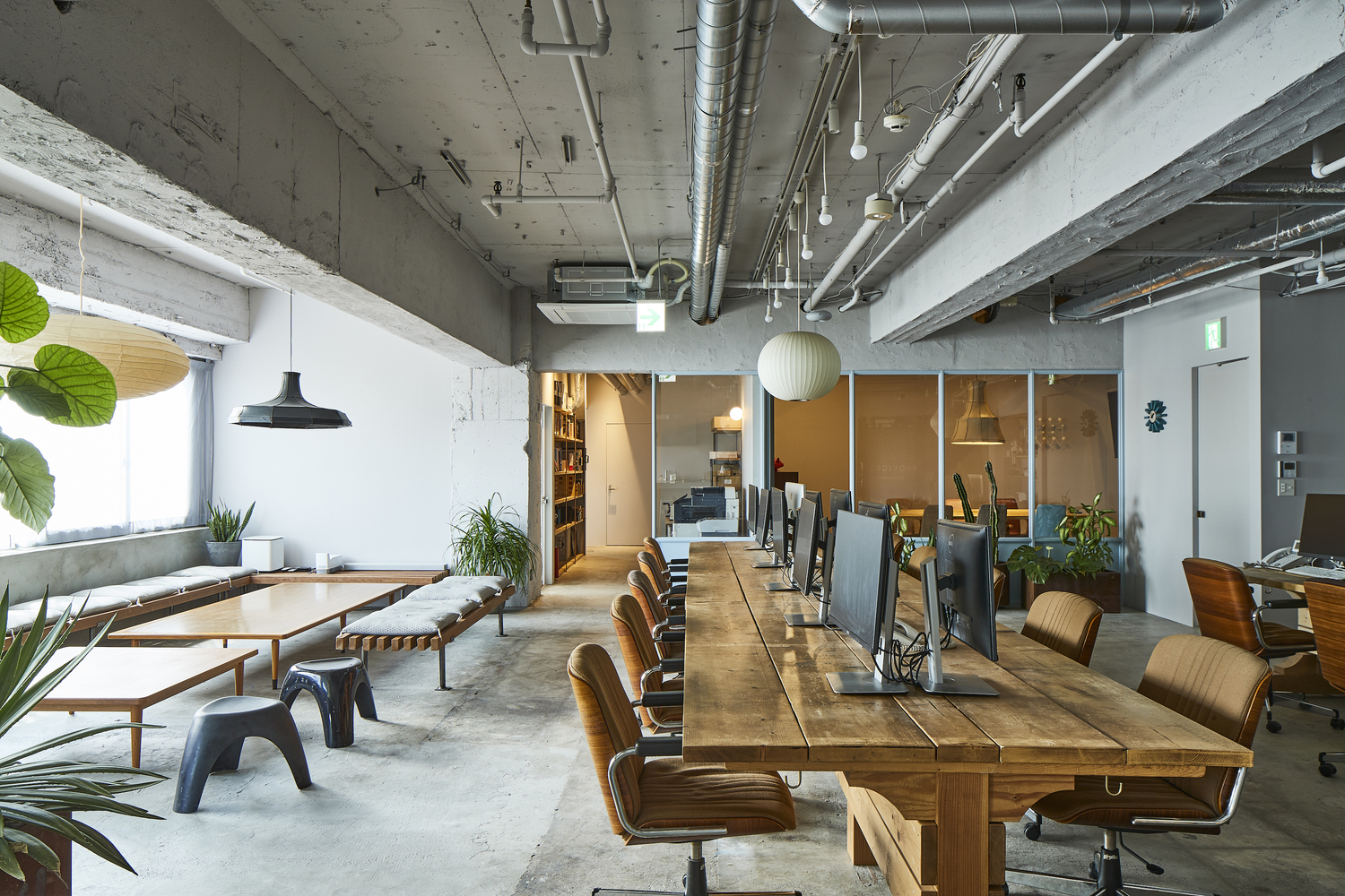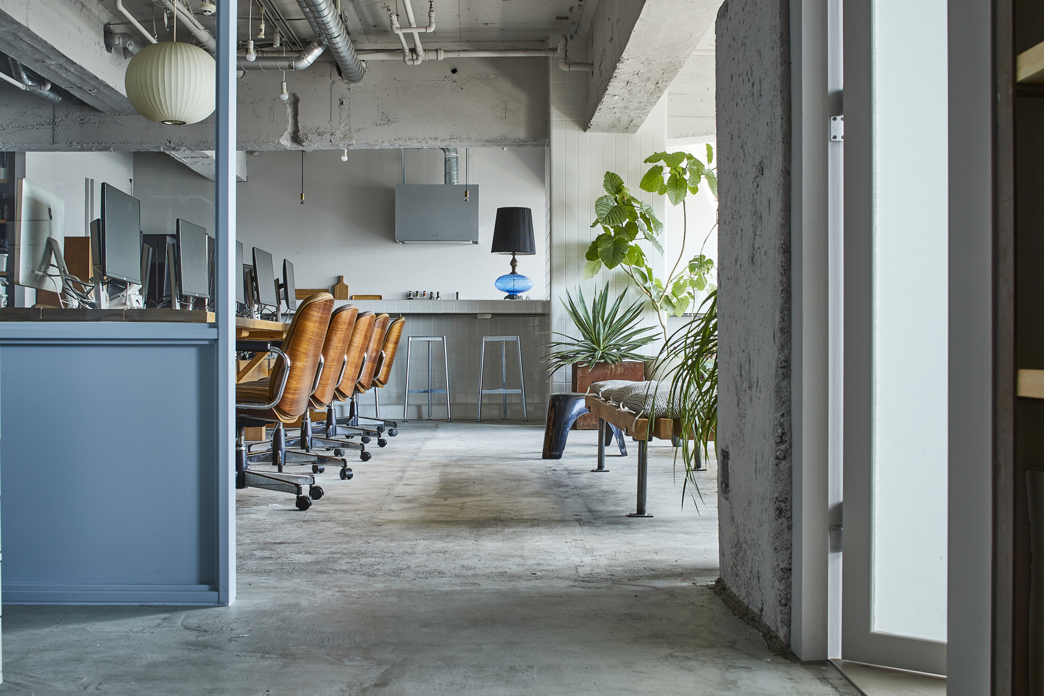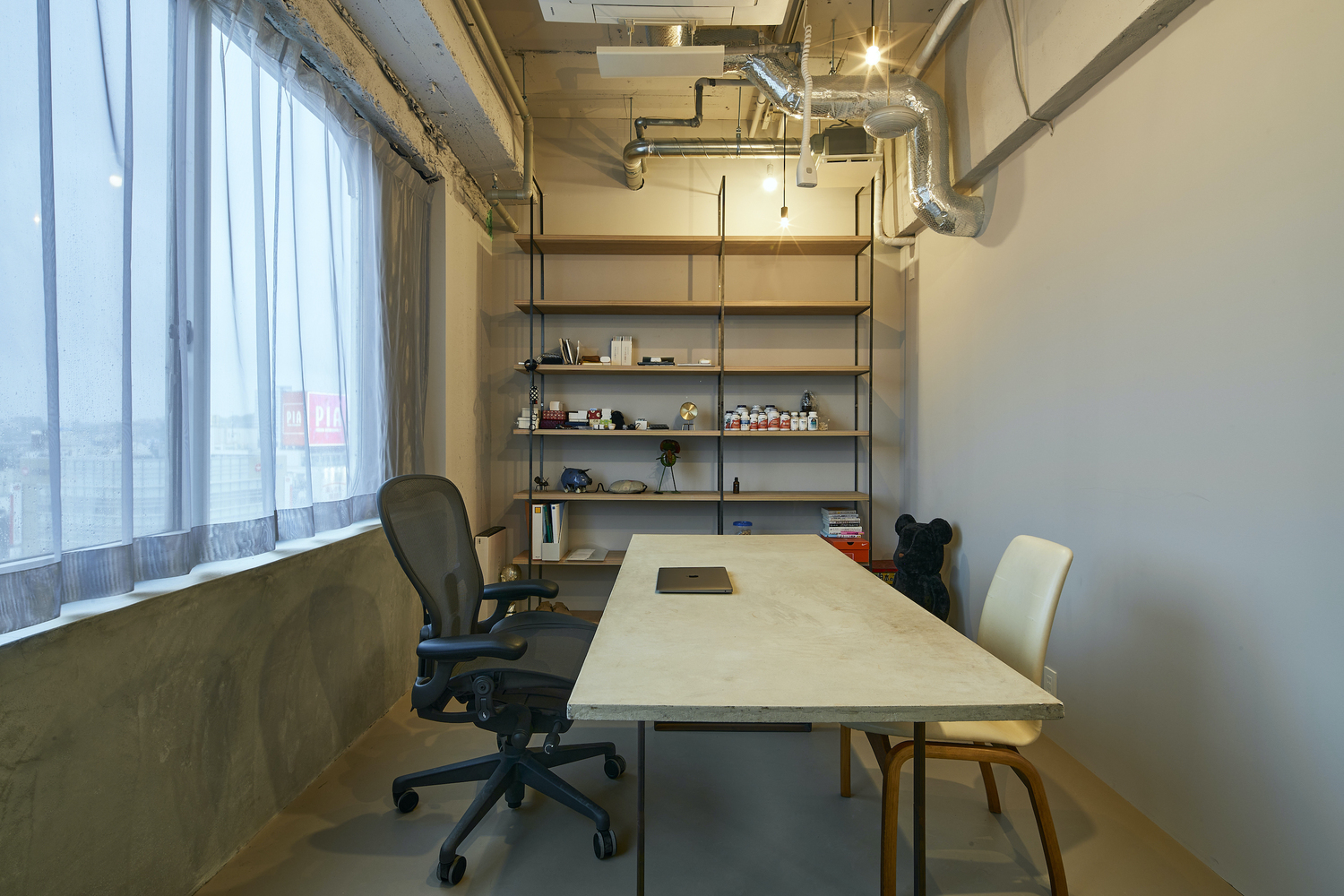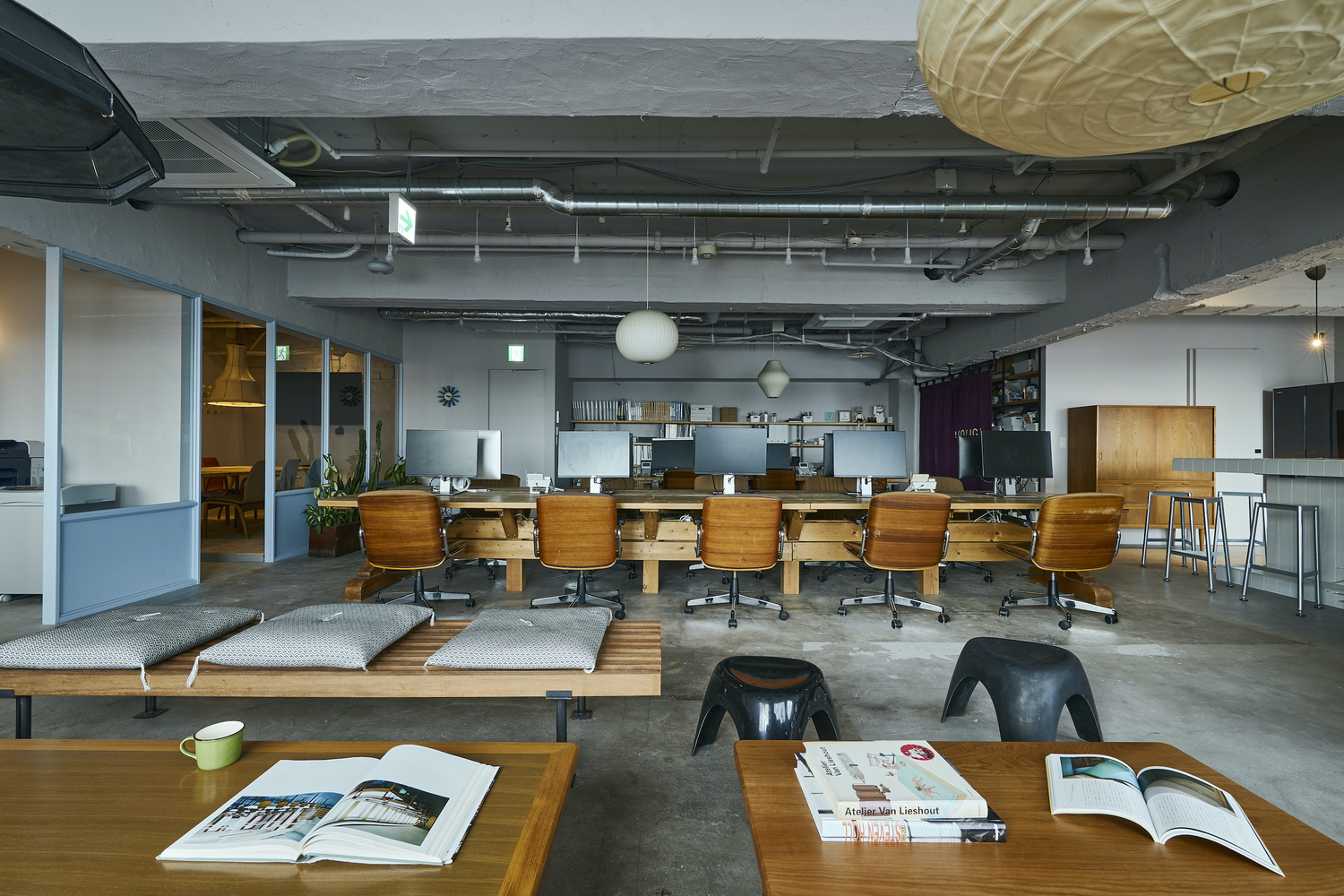 The entrance hall doesn't head directly to the main office since it’s intended to work as noise insulation from the public units outside. Because of that, two doors in the hall lead to different spaces: the front one to the workplace and the side one to the meeting room. The latter is accessible from the main space too and is designed for providing guests with a domestic atmosphere. Indeed, the entry and meeting room pavements are the only finished floor, as opposed to the raw concrete used for the other spaces. The mid century cupboard and seats evoke a shade of vintage, while the windows deliver a view over the entire place.
