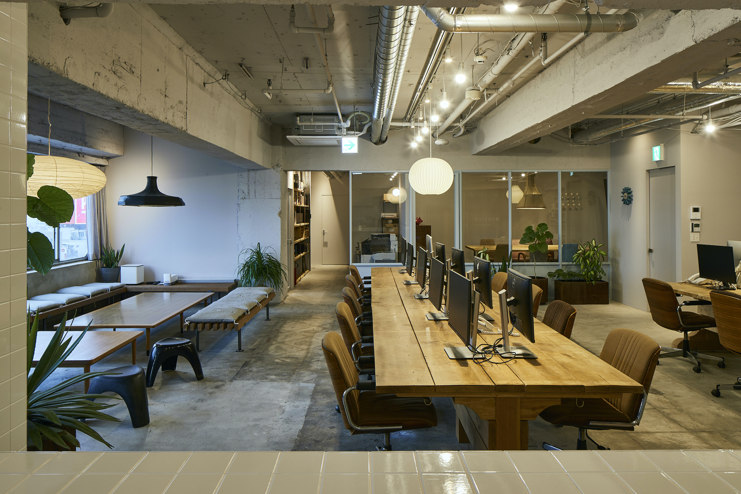 Just in front of the openings, the living area is composed of tailored mid-century style coffee tables, surrounded by crafted ita-uba timber benches. Between the living and the kitchen, various plants and flower pots transmit a calm sensation. Combined with the majestic sight of Mount Fuji overcoming Yokohama’s high-rise buildings, the living room becomes a comfortable spot for receiving informal meetings. The kitchen develops along the southeast side of the office, perpendicularly to the staff desks creating a disconnection between the two. The custom-made kitchen table encloses the room providing enough space for sharing a meal together or hosting parties with guests. The dining area is covered in white 10 cm square tiles that were used predominantly during the Showa Era. These grant a pleasant and calm feeling as opposed to the raw texture that characterizes the other parts of the office.