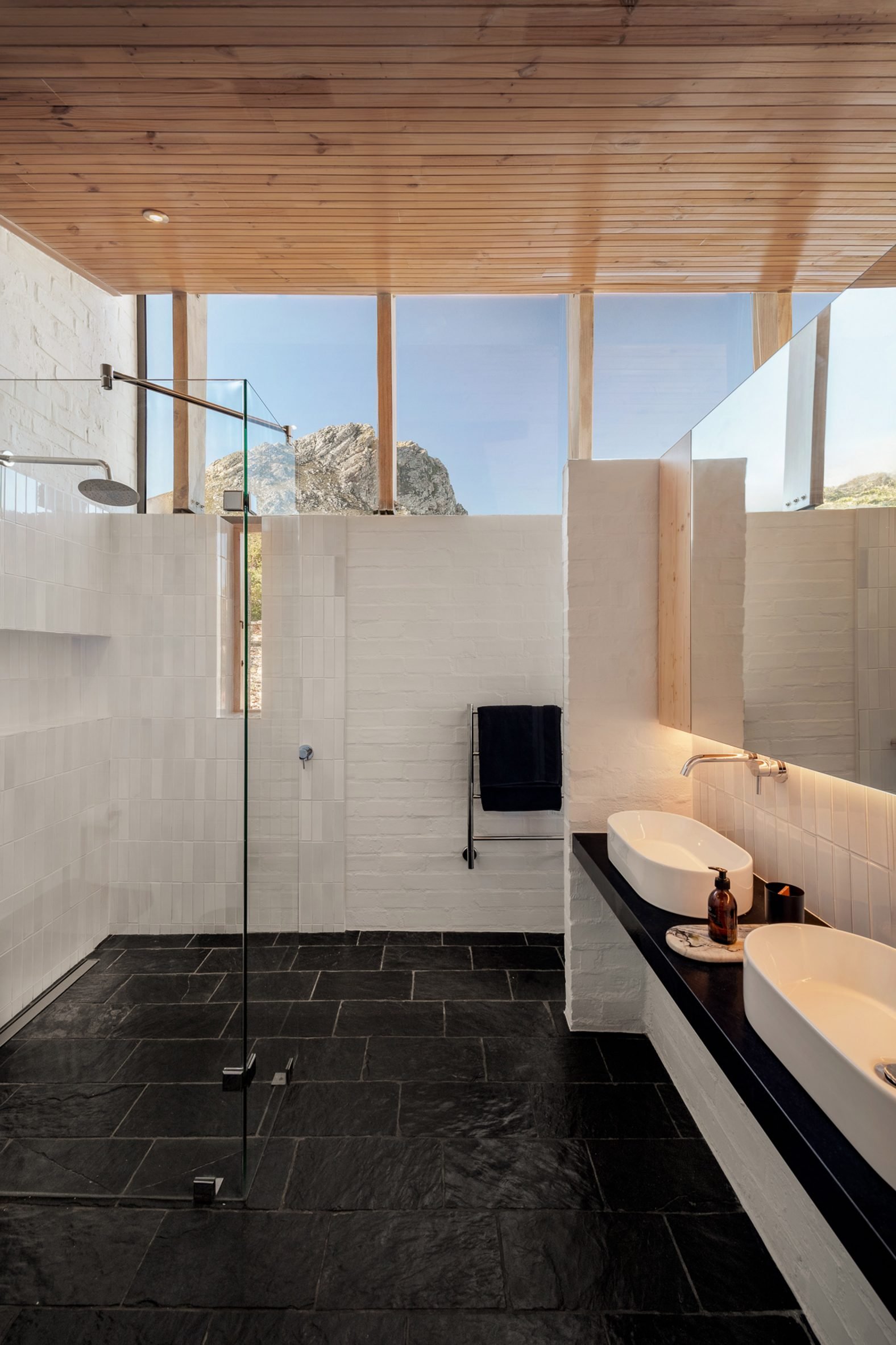 The mono pitched roof of Hytte Riverview slopes upwards towards the rocky rear of the site. This creates space for clerestory windows that illuminate the bedrooms without disrupting the feeling of "sanctuary" created by their white-rendered and bagged-brick walls.