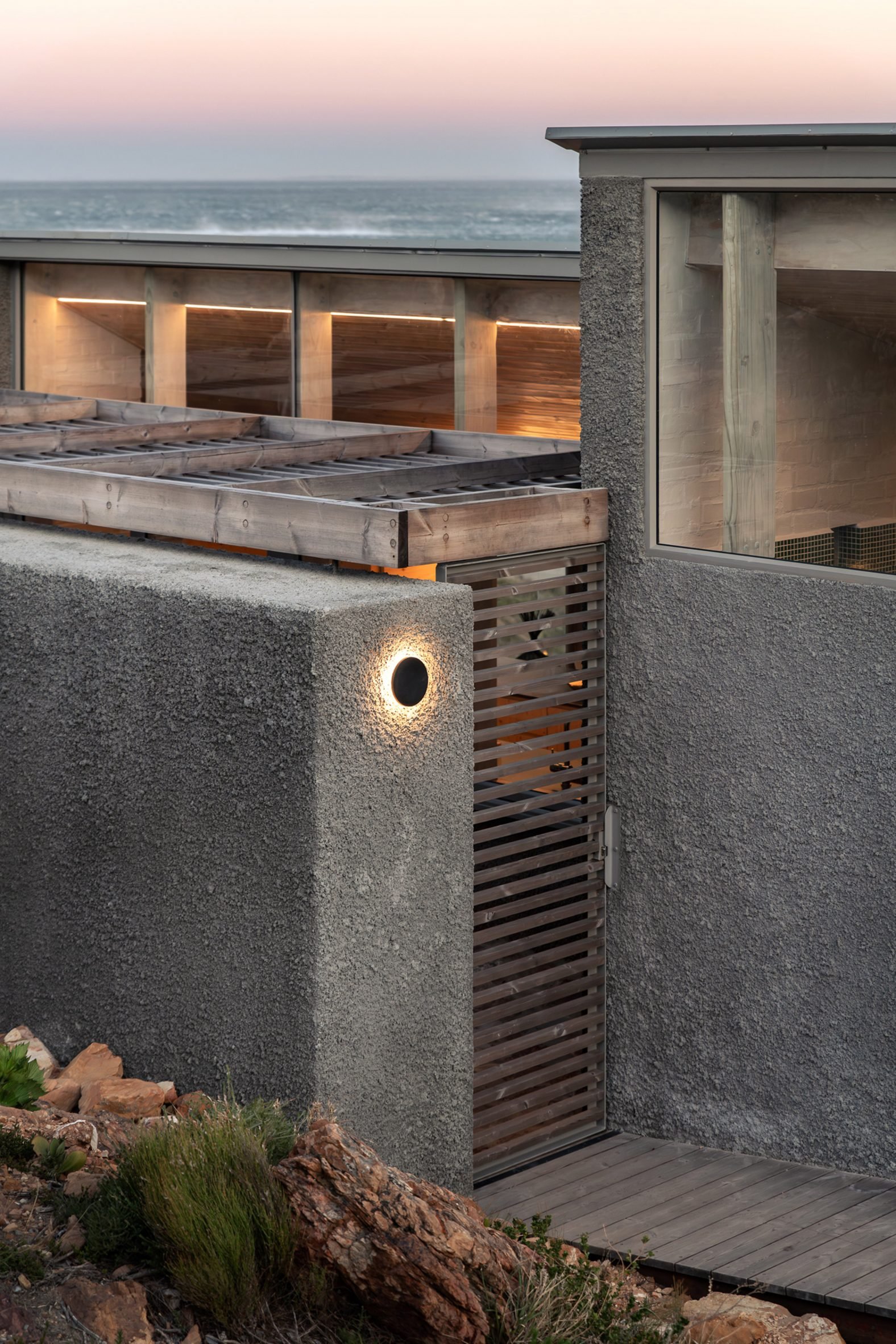 외벽의 거친 플라스터 마감과 슬레이트 타일 바닥은 주변 바위와 시각적으로 조화를 이루며, 내부는 연한 목재 천장이 따뜻하고 자연스러운 분위기를 더해줍니다. 미학적 요소와 기능적 요소가 조화를 이루어 이 주택은 남아프리카 건축에서 자연의 미를 강조하는 새로운 트렌드를 제시합니다.
