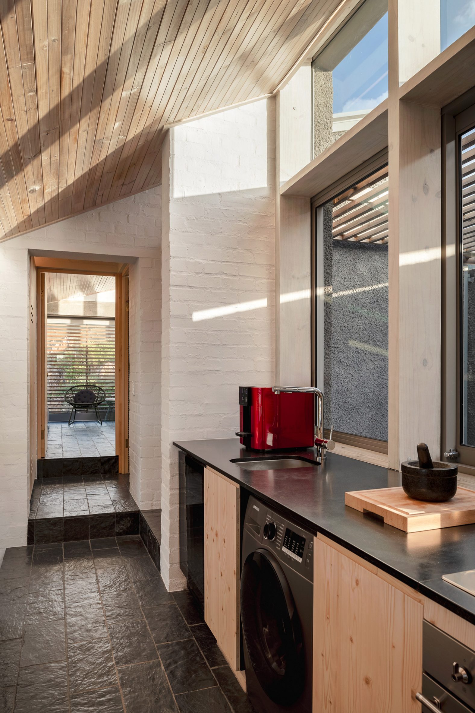 The different areas of Hytte Riverview are connected by a central spine, along which runs a narrow kitchen that steps up from the living area.