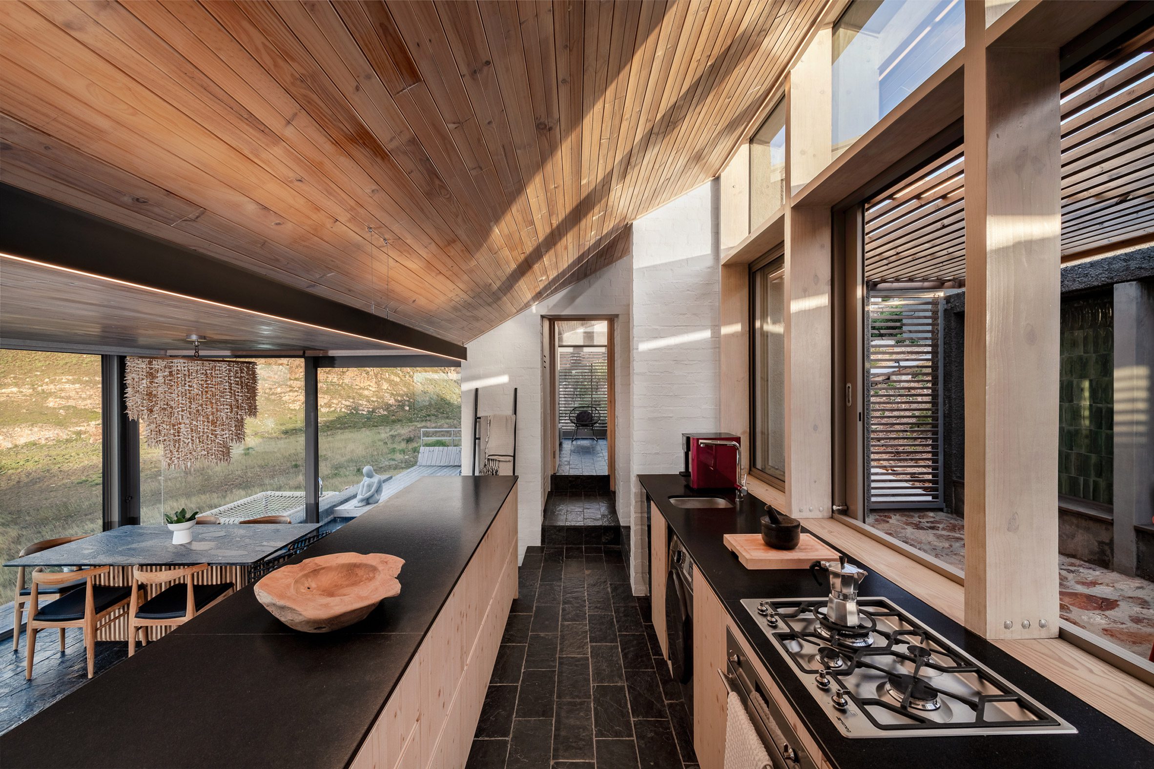 The 110-square metre home is nestled into the rocky, sloping landscape of Rooi Els in the Western Cape, enjoying views of the Rooi Els River flowing into False Bay and the sea beyond.