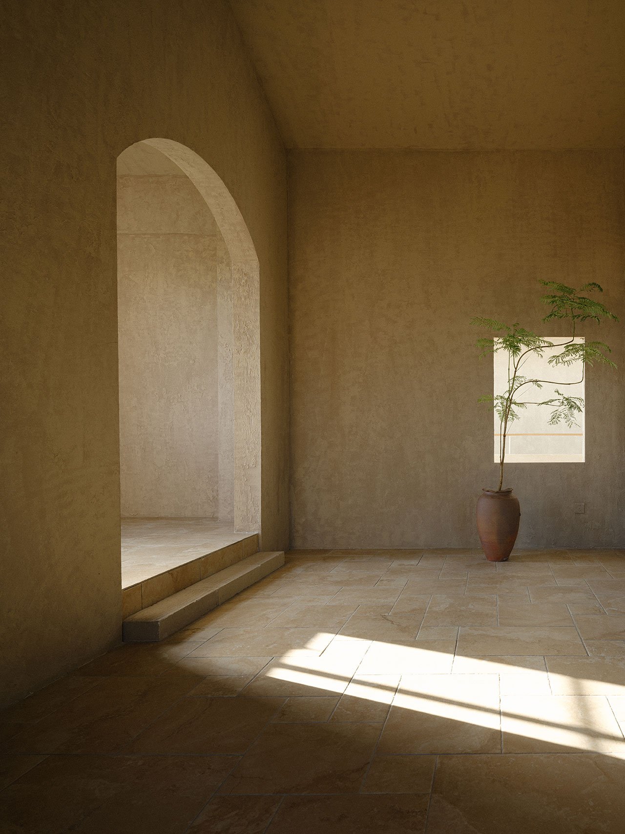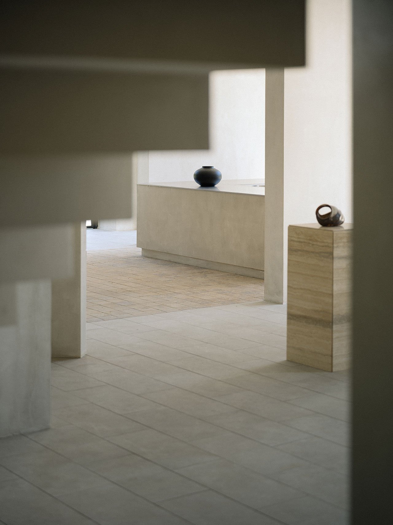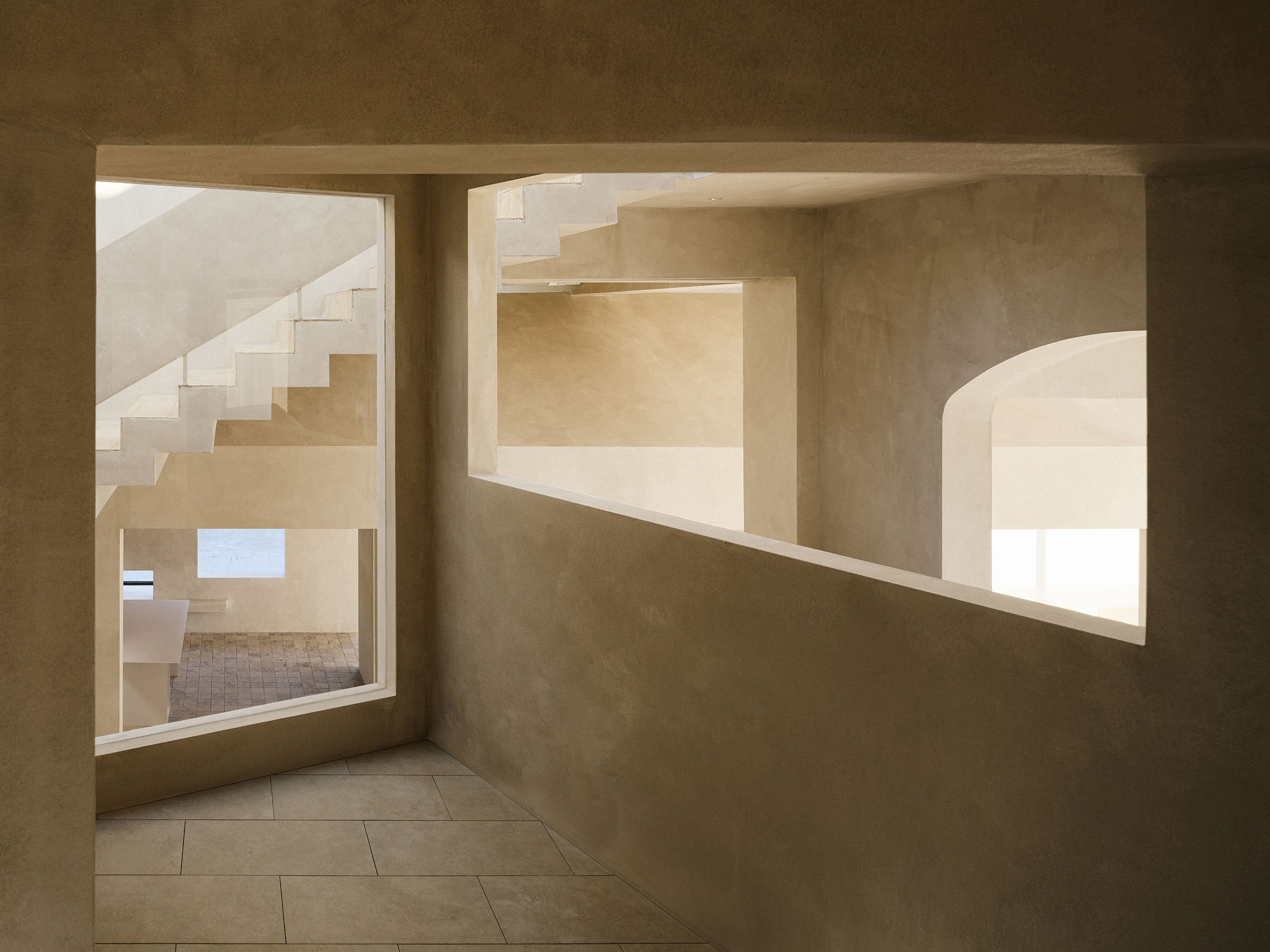 The lime plastered walls serve as an understated yet versatile backdrop for exhibitions, providing a neutral canvas that highlights the displayed works without distraction. At the same time, they poetically enhance the changing hues of daylight, reflecting warm tones at sunrise and cooler shades as the sun sets, further connecting the interiors to the natural world outside.