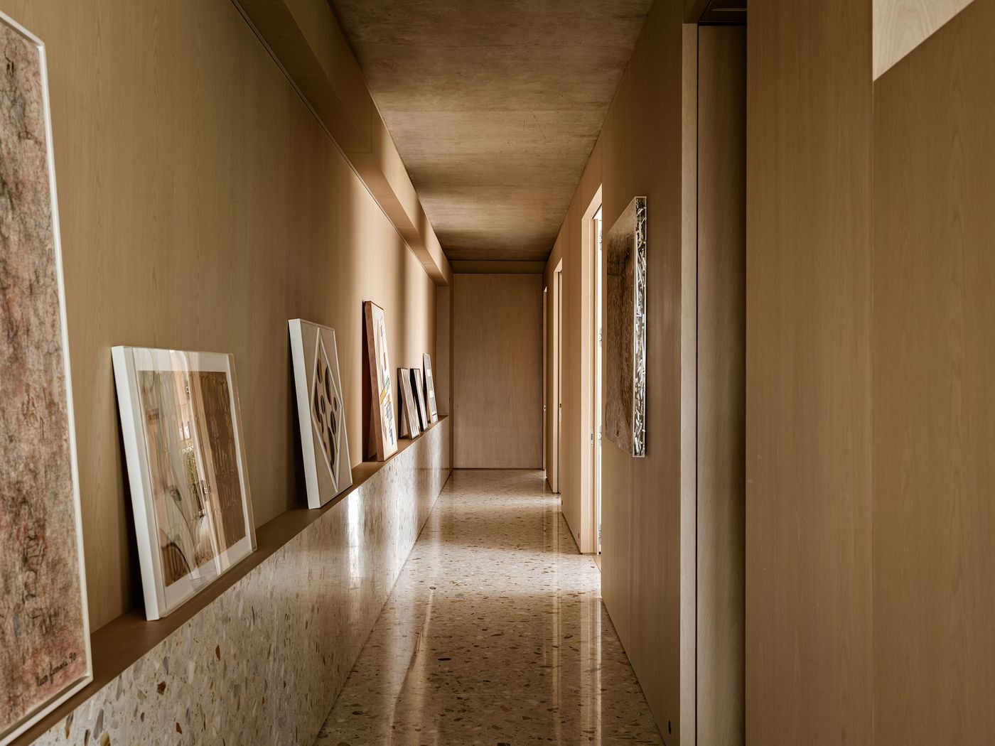 이동 공간조차 세심한 배려를 받는다. 사적 공간으로 이어지는 복도는 얇은 메탈 선반을 따라 전시된 미술작품들과 함께 캐주얼한 갤러리 역할을 한다. 침실에서는 테라조 바닥과 콘크리트 천장이 오크 파케트와 목재 패널링에 자리를 내준다. 은밀한 조명과 목재로 감싼 천장은 마스터 침실의 친밀감을 높이고, 욕실은 다시 테라조의 대담함으로 돌아가며 Casas의 독립형 '미네랄' 욕조로 마무리된다.