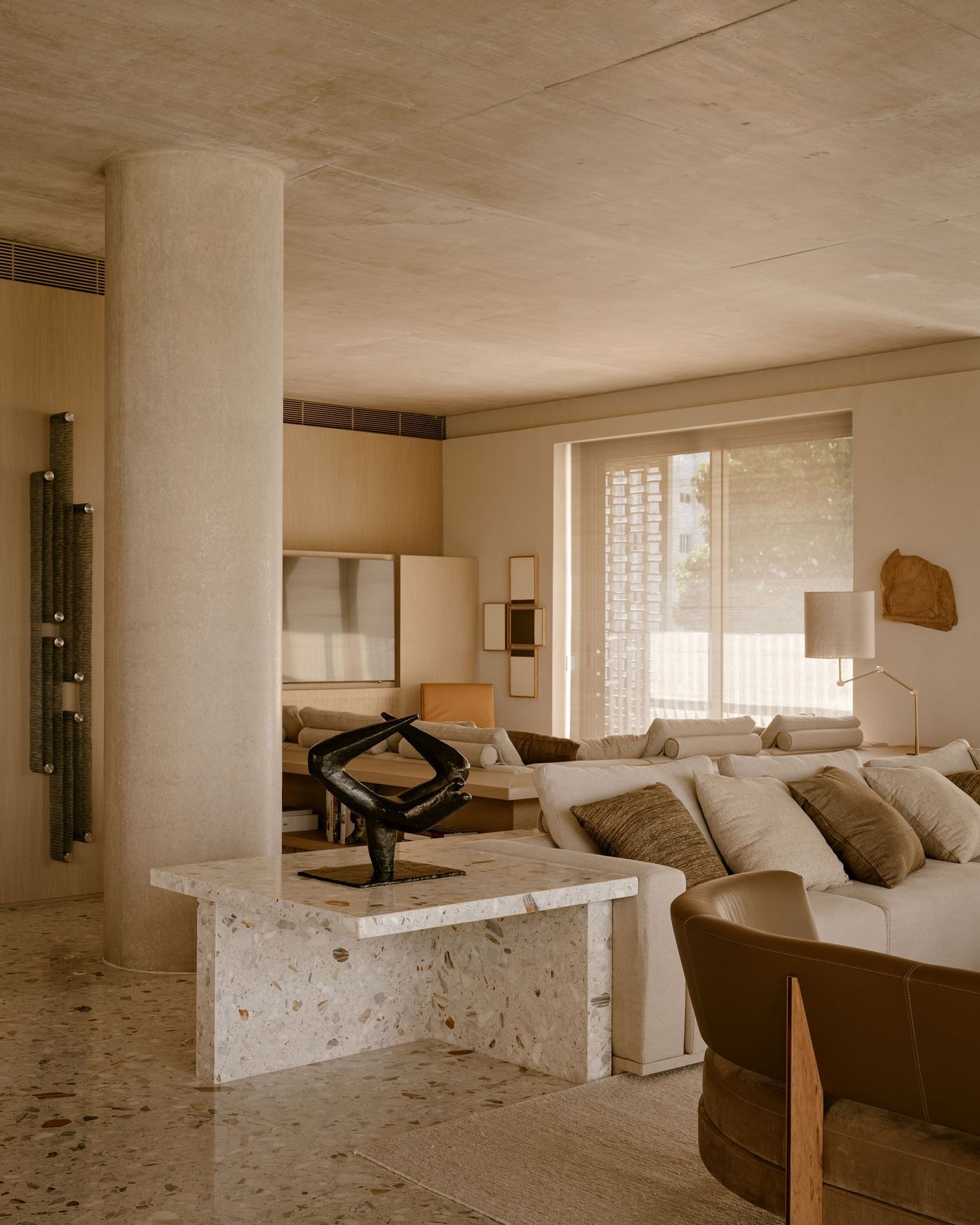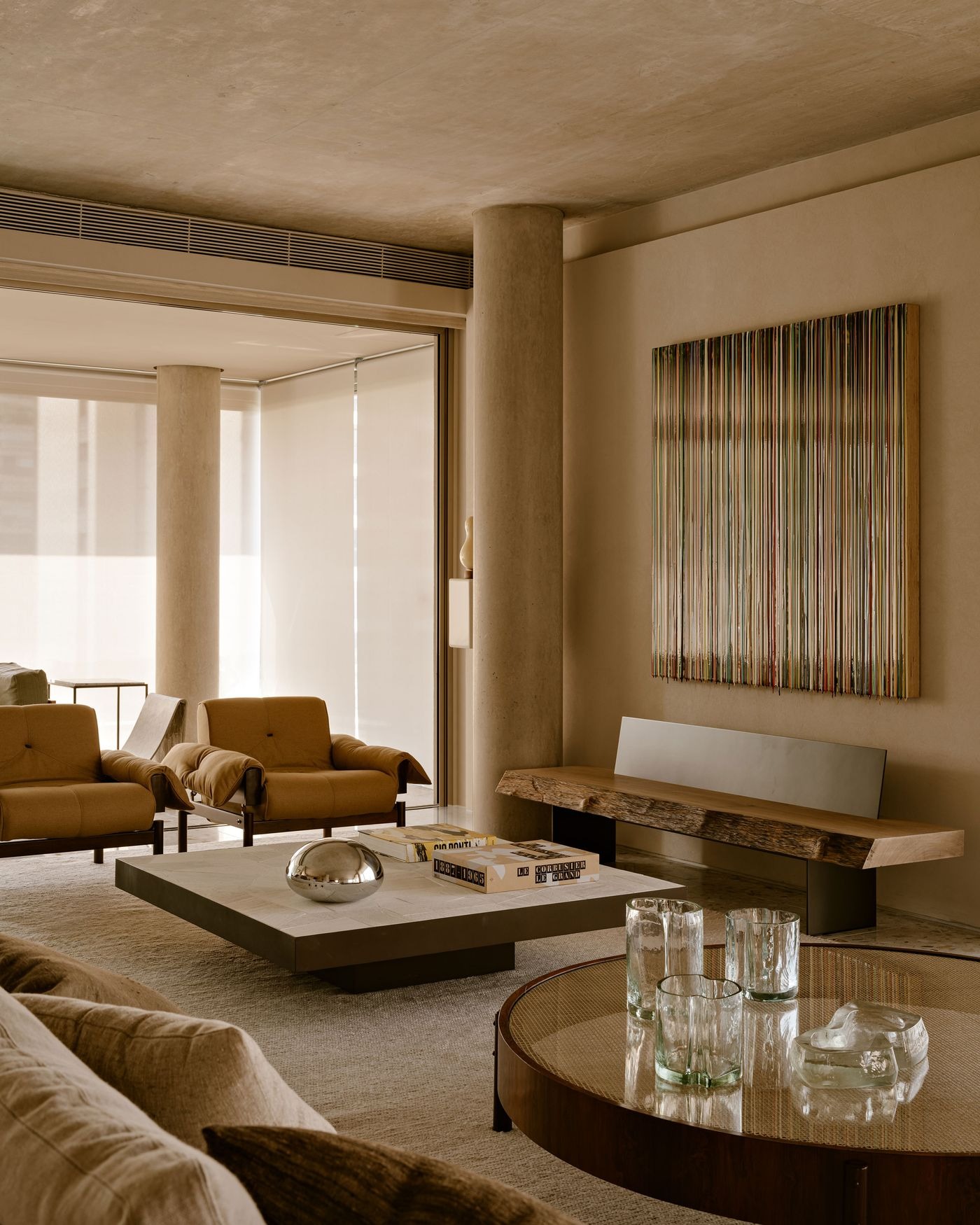 Commissioned by an art collecting couple with a passion for entertaining to design their apartment in São Paulo’s tree-lined Vila Nova Conceição neighborhood, Brazilian architect Arthur Casas opted for understatement, bathing the interior in a monochromatic palette of warm beige. That is not to say that the property lacks drama, it doesn’t, but it emerges more subtly: in the panoramic views of the city skyline; in the fluid, interconnected layout designed for convivial living; and in the rich interplay of terrazzo, exposed concrete, and finely detailed wood panelling. Furnishings designed by Casas himself, alongside Brazilian modernist classics and contemporary pieces, lend character without disrupting the apartment’s serene equilibrium. The result is a refined synthesis of material restraint and compositional clarity that channels the spirit of Brazilian modernism through a contemporary lens.