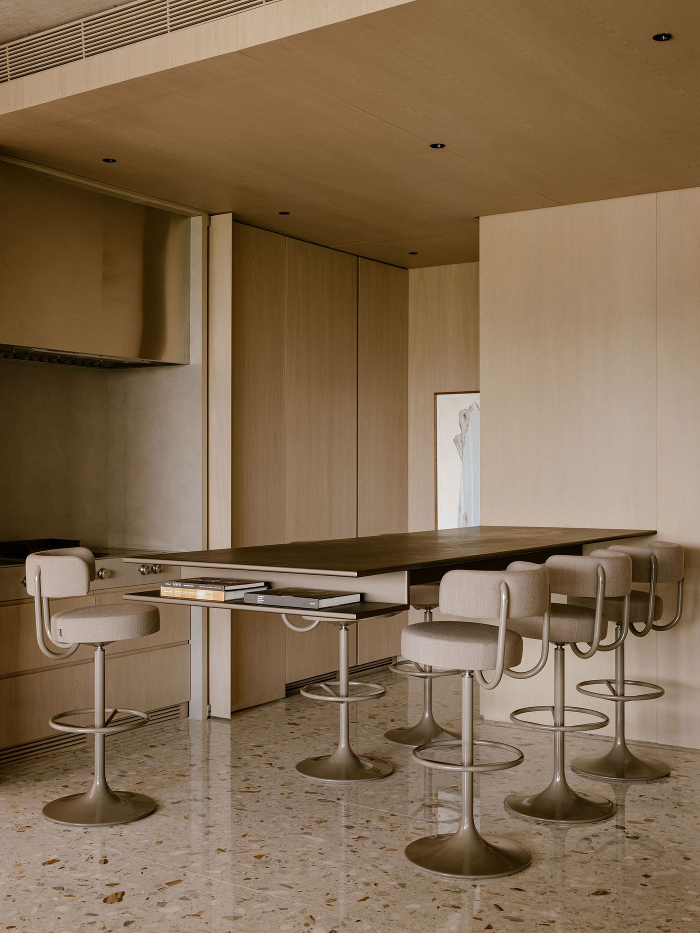 In the adjacent kitchen, form meets function in a cantilevered metal plank table that doubles as an island and dining counter. Sand-hued Jupiter stools by Johanson Design reinforce the industrial chic sensibility, while minimalist wooden cabinetry discreetly conceals Gaggenau appliances, extending the apartment’s language of elegant understatement.