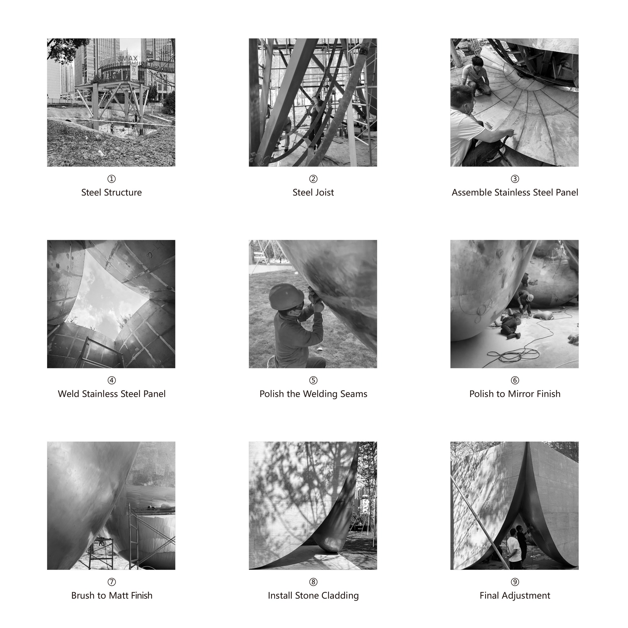 Though serving distinct purposes, the three pavilions share a common language, achieving visual cohesion while responding subtly to their unique functions. The porous architecture invites wind and light to flow freely through the structures. The outer facades are composed of modular panels of porous white travertine, while the inner spheres are assembled from curved stainless steel plates. In the library and chapel, the inner surfaces are finished with a soft and tactile sandblasted texture, creating a contemplative atmosphere. In contrast, the stage features polished mirror-like steel, reflecting dynamic lights and movements from its surroundings.