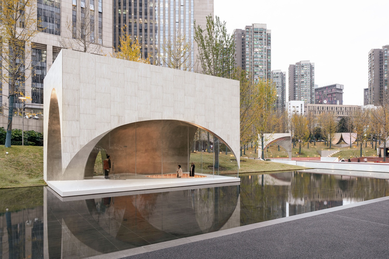 시간의 흐름에 따라 이 건축물들은 전혀 다른 표정을 보여준다. 계절이 바뀌면서 은행나무 숲은 푸른색에서 황금색, 호박색으로 순환하며 세 파빌리온과 조화를 이루어 끊임없이 변화하는 자연과 건축의 몰입형 교향곡을 연주한다.