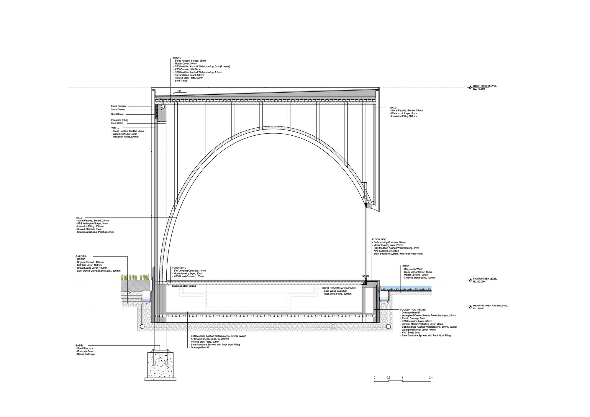 구이저우성 토착 카르스트 산악 동굴에서 영감을 받은 시마 도서관, 은행나무 예배당, 달리 무대는 도시의 자연 지형에서 솟아오른 조각적 형태로 구상되었다. 한국 전통 누각이 자연과 하나 되듯, 이들 현대적 파빌리온도 공간과 빛의 힘에 의해 형성되어 안쪽으로 파인 떠 있는 뾰족한 아치를 이룬다. 구조적 균형과 긴장의 시학을 표현하는 세 조각적 형태는 각각 독서, 공연, 명상을 위한 공간으로 기능하며, 주변 풍경의 서로 다른 요소인 물, 열린 하늘, 반짝이는 별빛과 공명한다.