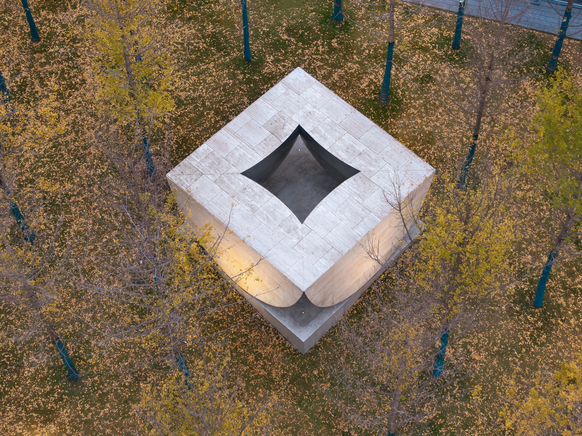 The Xima Library, set against the vibrant tapestry of fallen ginkgo leaves, stands gracefully by the water. It's rectilinear form encloses a luminous metallic dome that casts its silhouette upon the rippling water, like a moonlit shadow dancing with the breath of the breeze.
