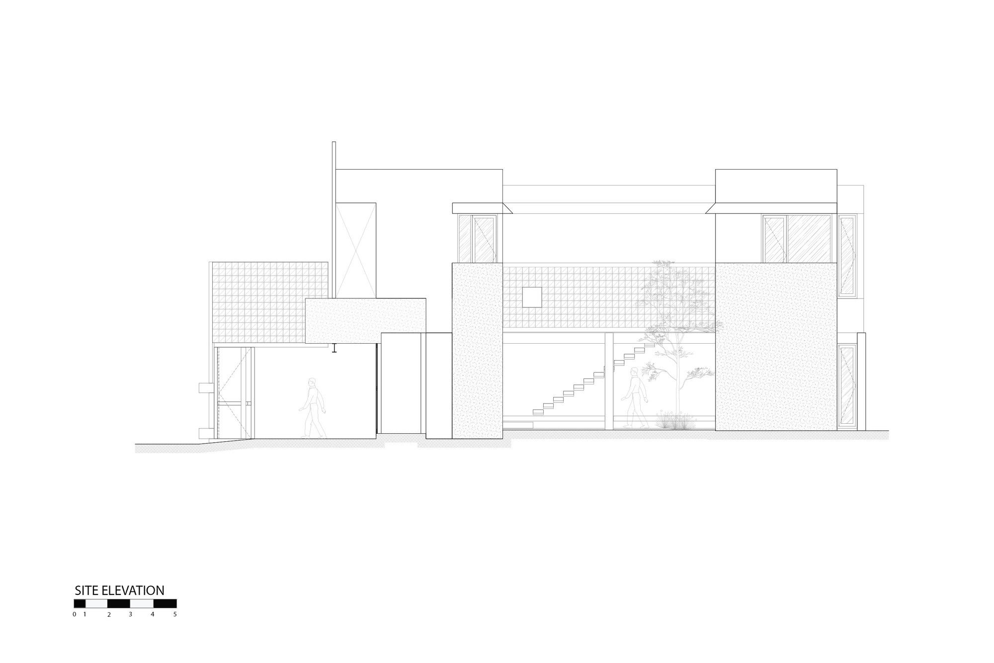 주방을 지나면 식당과 거실이 차례로 이어진다. 두 공간 사이에는 목재와 홈 파인 유리로 만든 반투명 칸막이가 서 있다. 이 칸막이는 영역을 나누면서도 시선과 공기는 막지 않는다. 경계가 흐려진 덕분에 각 방은 구분되지만 단절되지 않고, 빛과 공기가 자유롭게 통과한다. 집 한가운데에는 수영장이 있는 내부 중정이 자리한다. 한옥의 마당처럼 집 안쪽에 마련한 이 야외 공간은 기능적으로도 감정적으로도 이 집의 핵심이다. 중정은 앞쪽 공용 영역과 뒤편 및 위층 침실을 이어준다. 수영장 옆에 놓인 계단은 위아래 층을 잇고, 집 안을 이동할 때마다 야외를 거치도록 이끈다.