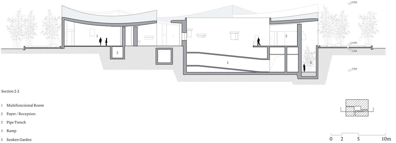 The architecture is simple and relatively rough with its material characteristics, such as concrete roofs, masonry stone walls, and so on. The hyperboloid roof sags due to gravity in nature, which also brings good tension to space. Although people are in a seemingly rectangular and simple space, due to the change of the roof, the homogeneous space becomes very tense.