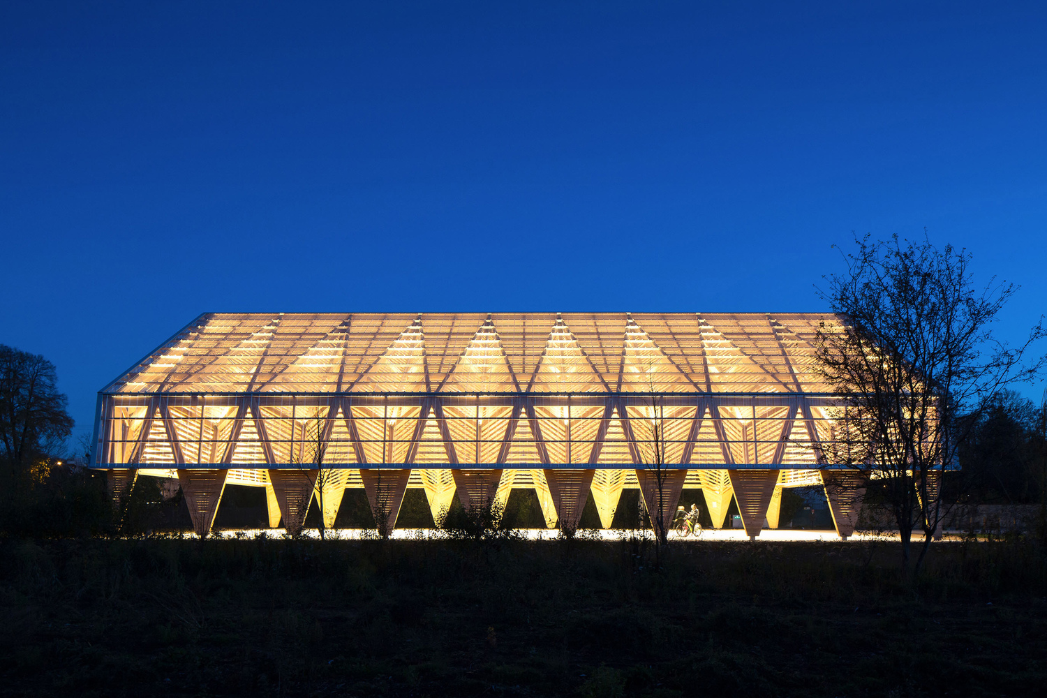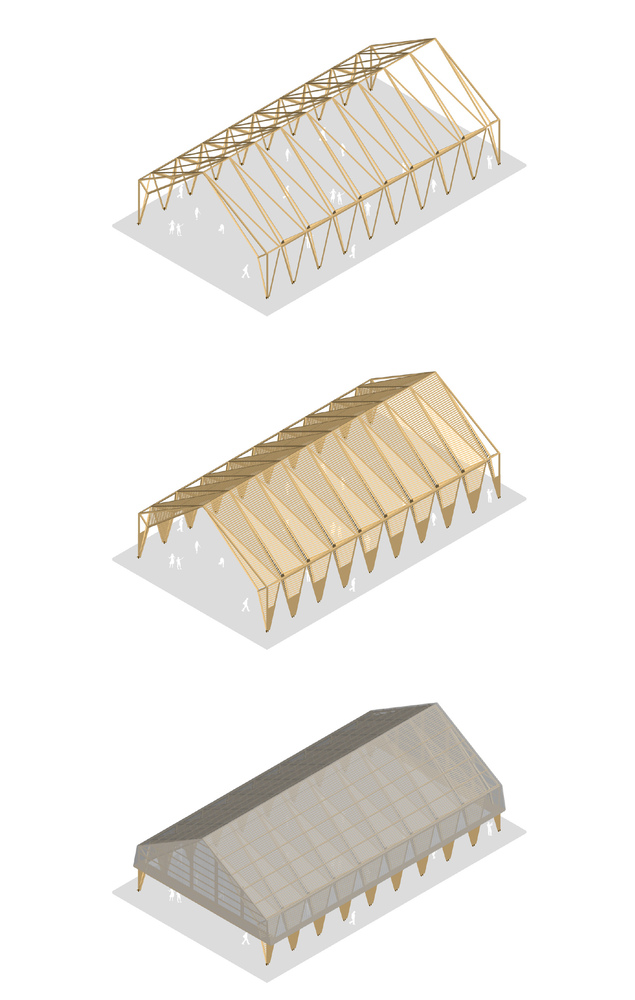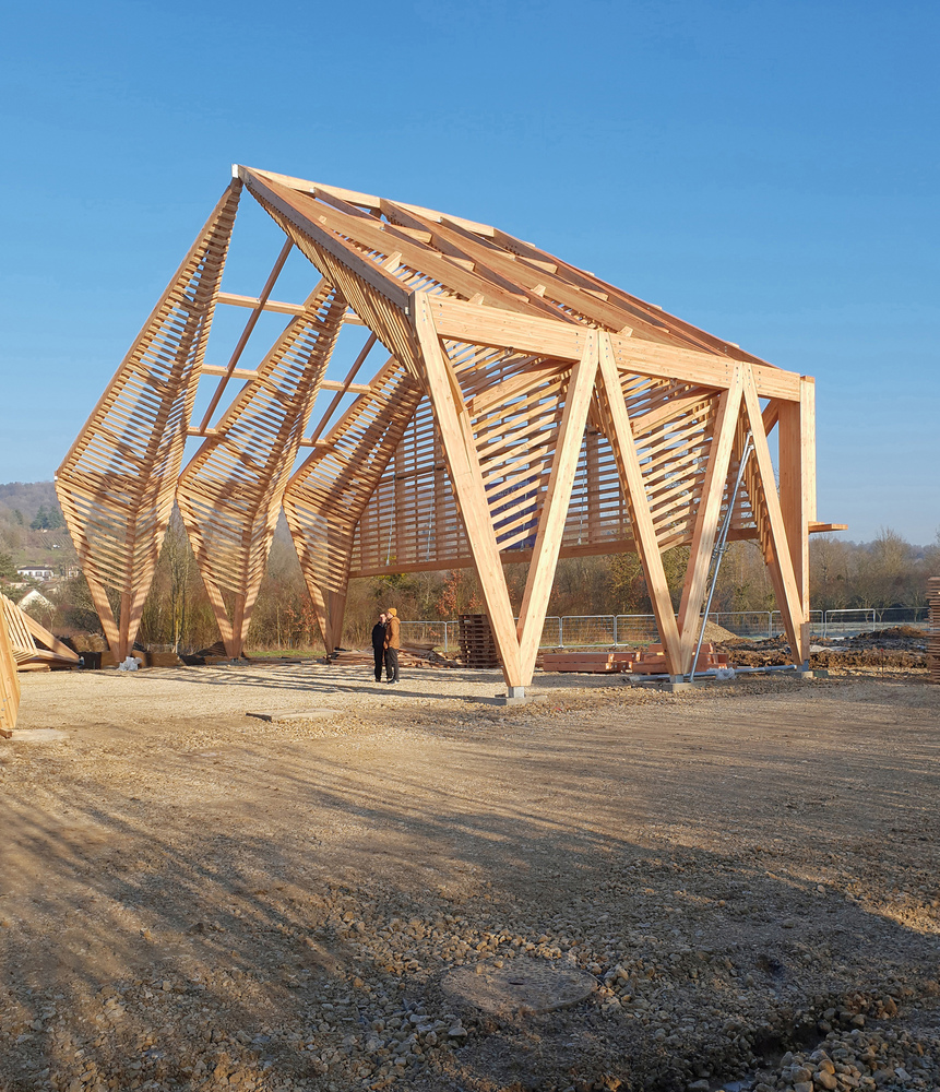 The main structure is made of glue laminated Douglas fir. The cladding and timber shell are in black pine coming from a communal forest. Finally, the roof is covered in transparent polycarbonate boards. And it extends vertically to cover the facade until 3 meters high.