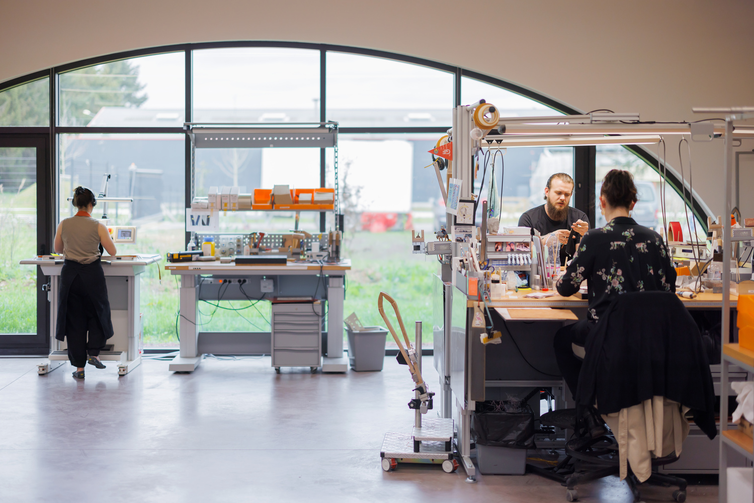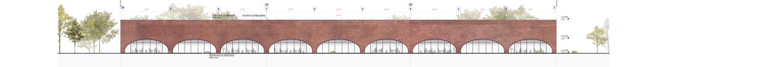Structural, Fine, and coupled, these bricks gallop along the building’s envelope, from span to span, they are orchestrated at 9-meter-long intervals drawing a perfect square from face to face: the plan of this factory. Like "an archeology of the future", this building literally emerges from the memory of its place, on the remains of a Magdalenian hearth attesting to the relationship between humans and their tools. It invites nature at its heart, drawing time between the lines of architecture and the sinuous landscape remodeled by the excavated earth of the site.