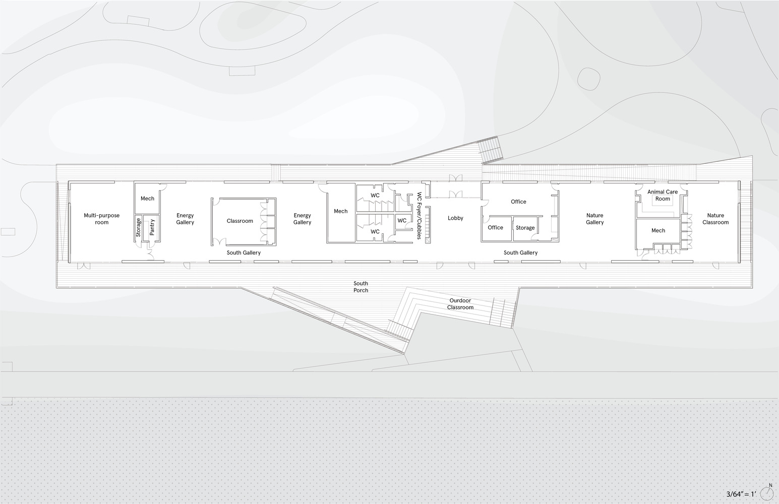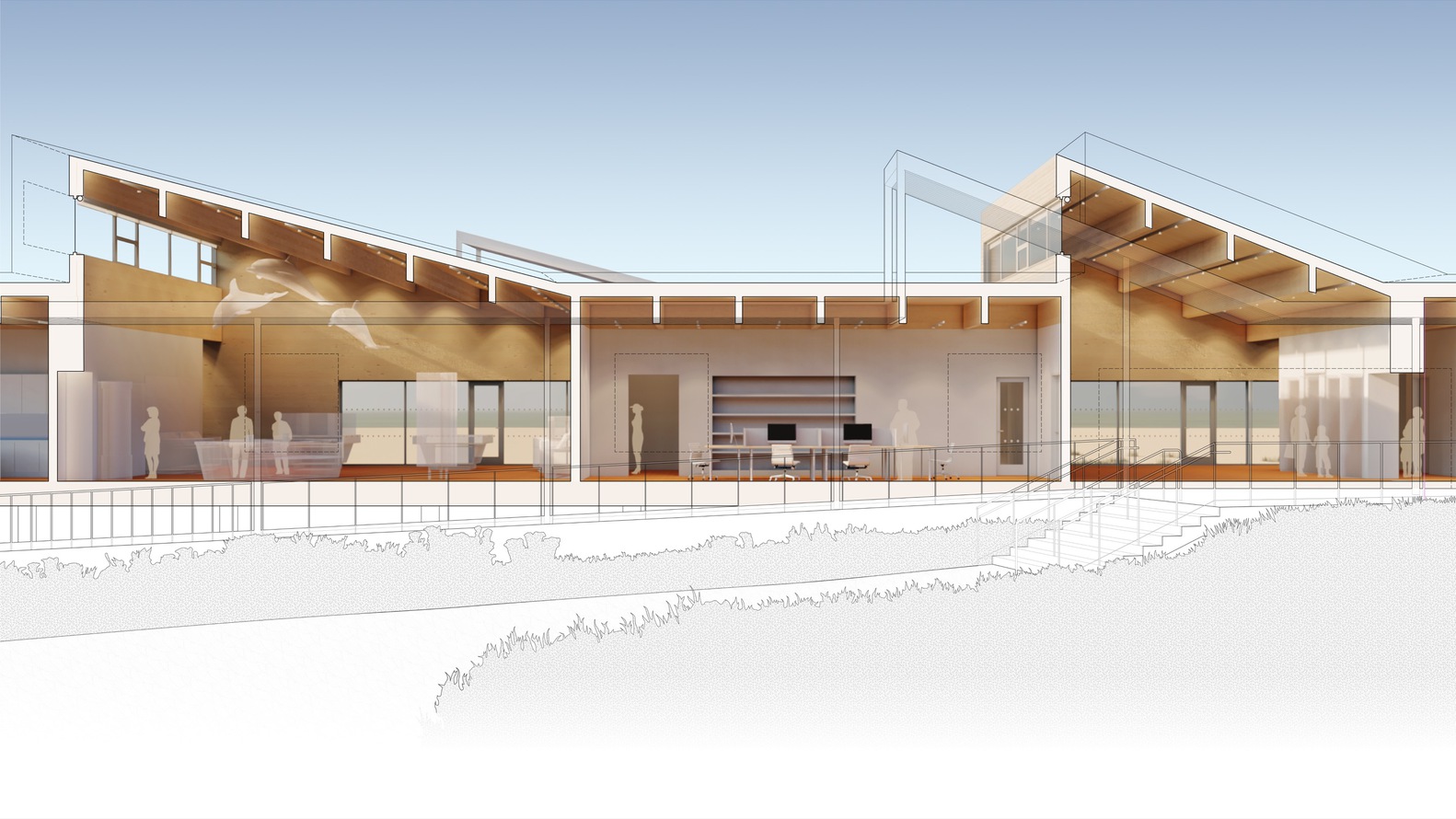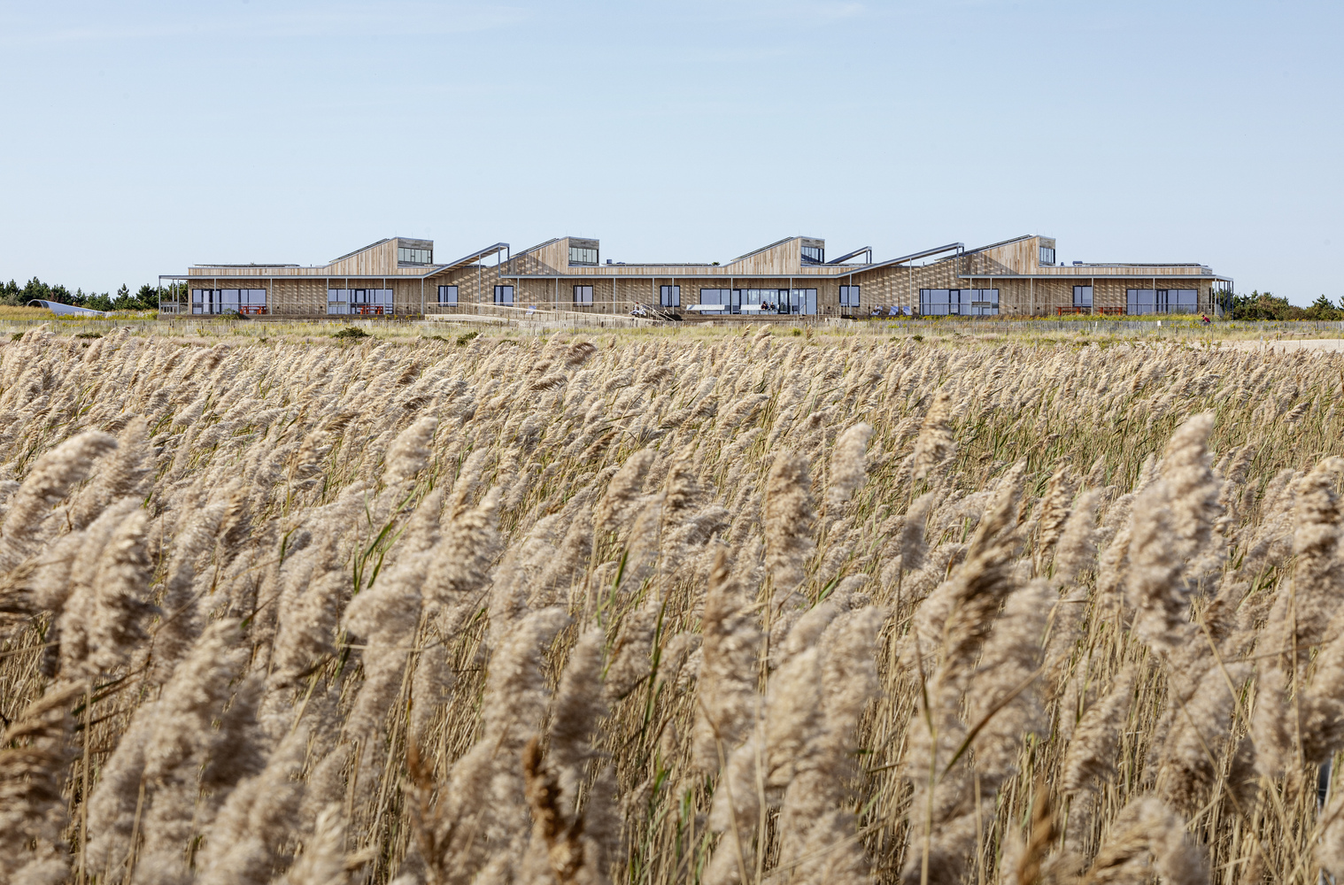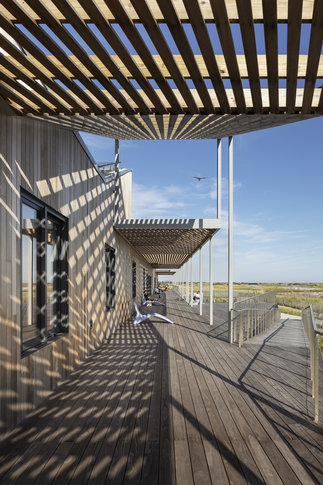 At 330’ in length, the linear one story building rises from foundations belonging to a previous 1960s bathhouse, extended on either side to accommodate the Center’s educational program. As a result of resiliency measures, the building perches above the horizon, providing immersive views of the dunes and the Atlantic Ocean to its South. Future visitors may one day glimpse the vast offshore Empire Wind Project far out at sea.
