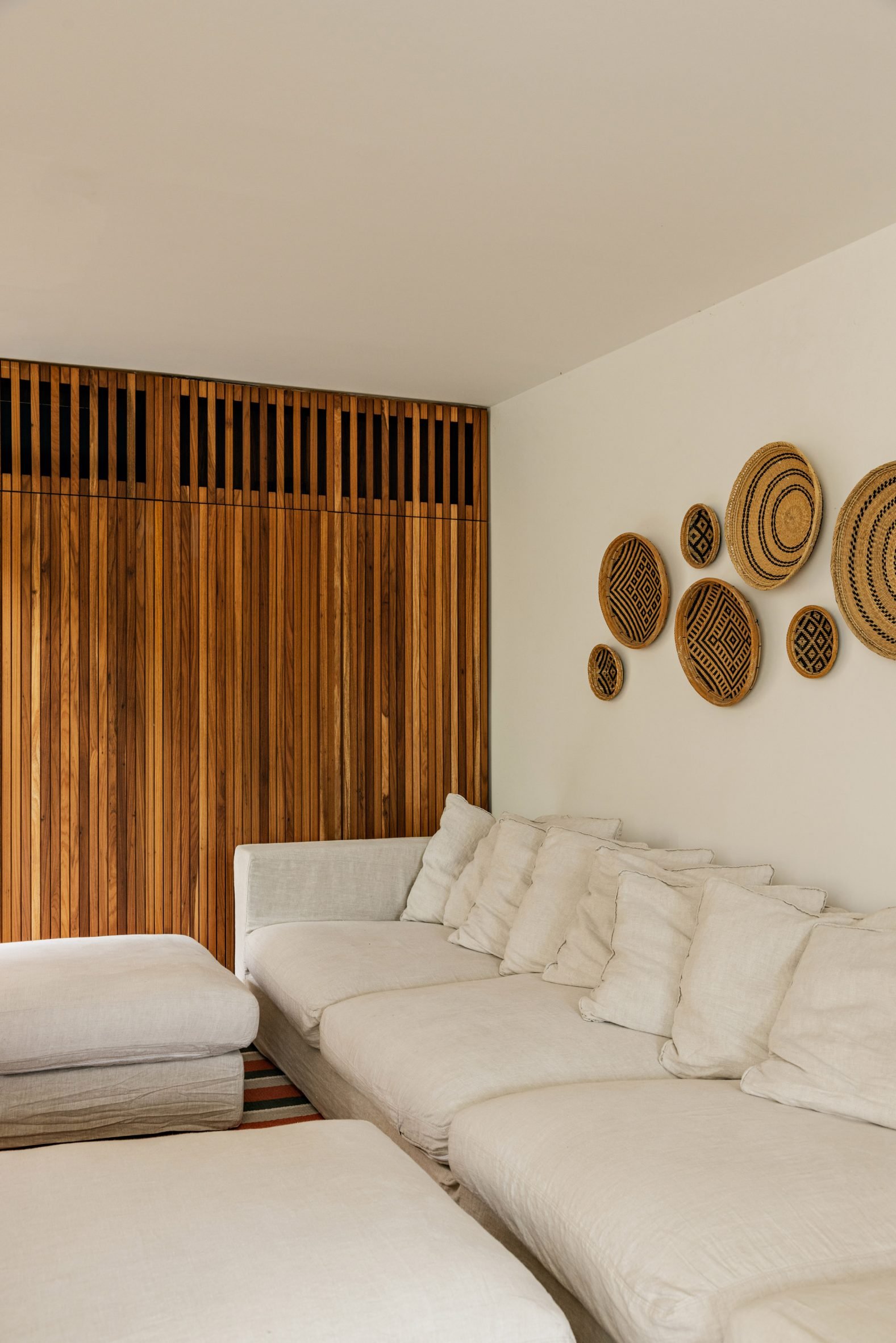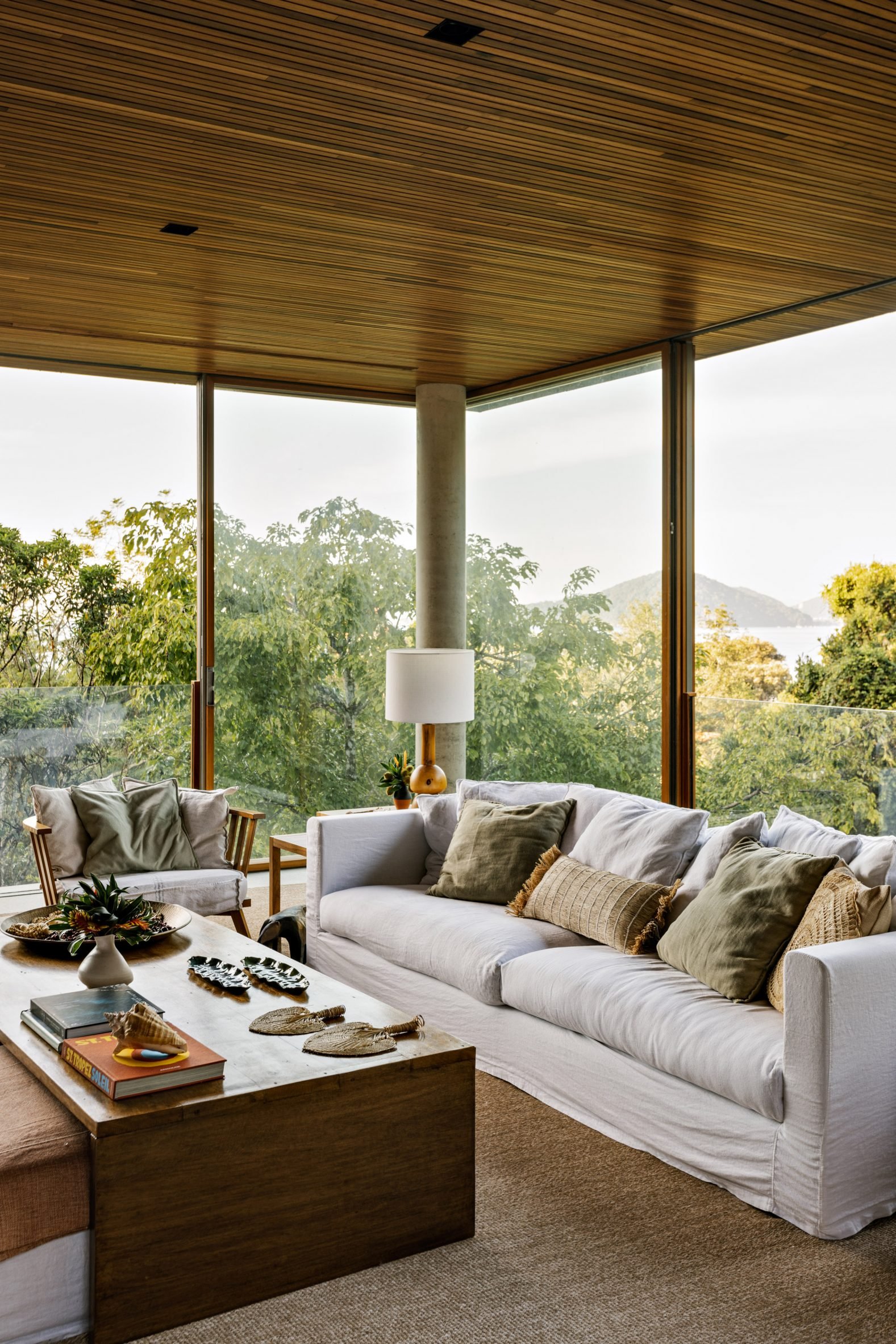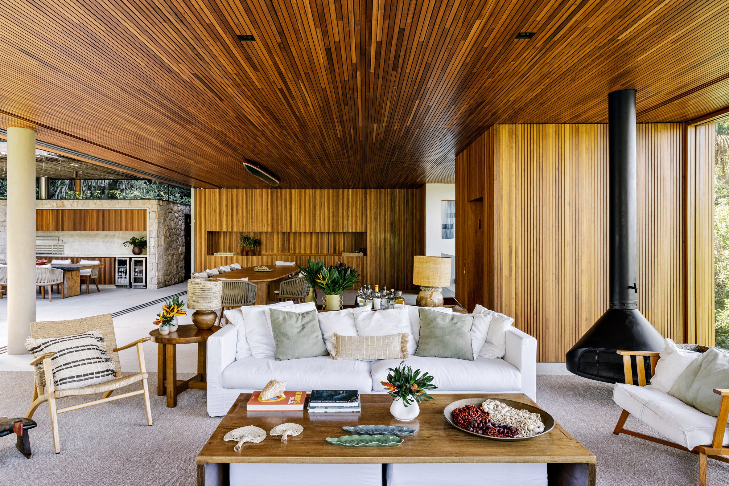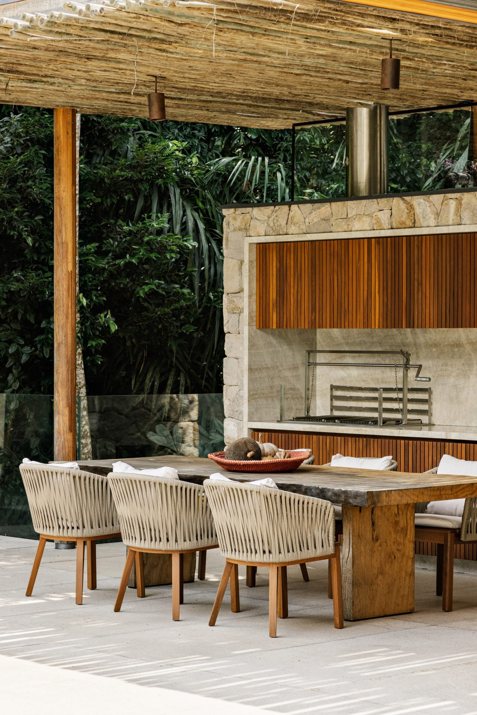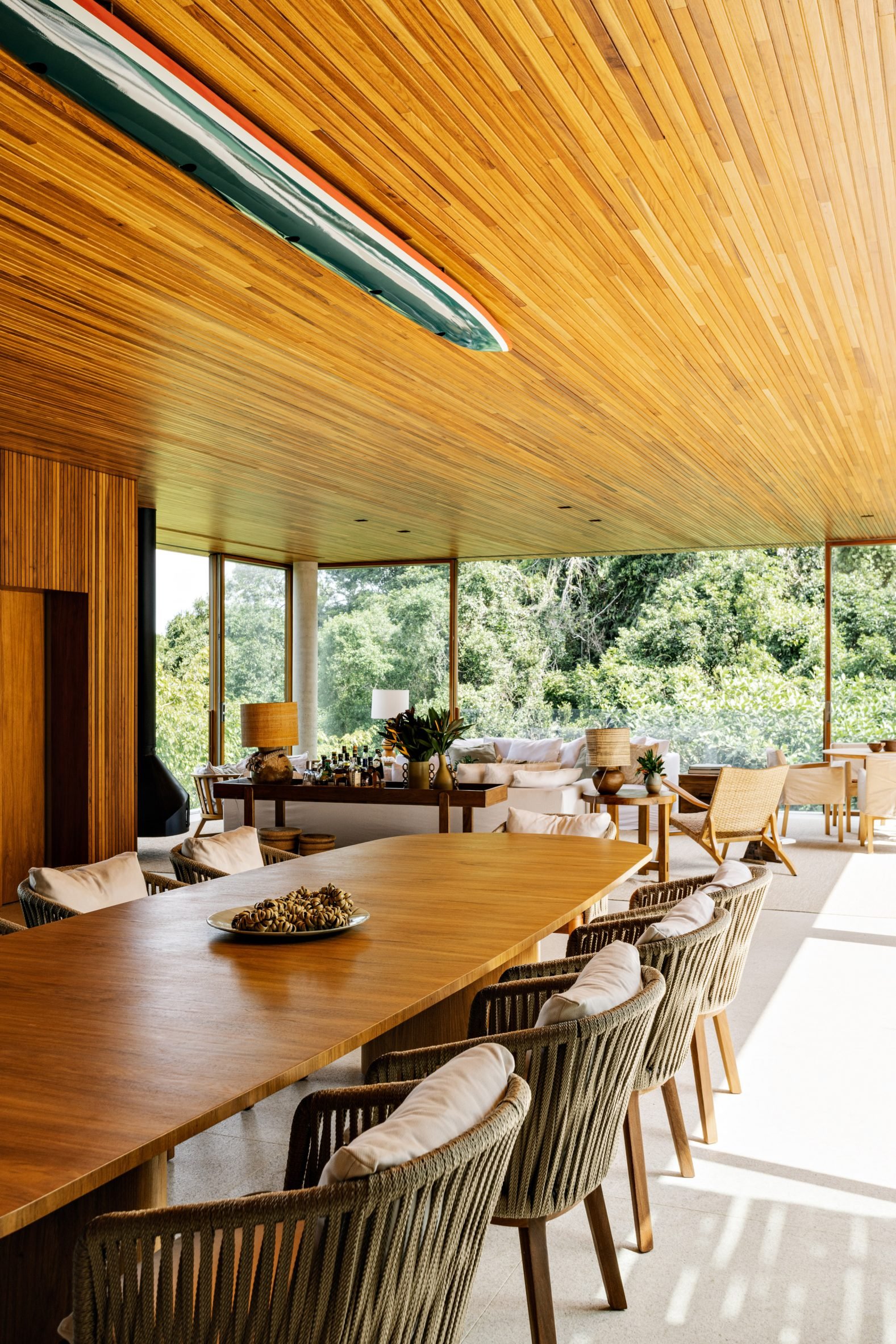 "In decoration, the mix of pieces in wood, linen, straw, rattan and ceramics suggests the simplicity of an authentic beach house, without forgetting easy maintenance and durability against the effects of time and sea air," the team said, noting the pair of Jocal sofas and waterproof-canvas Iporanga House, Marina Salles armchairs.