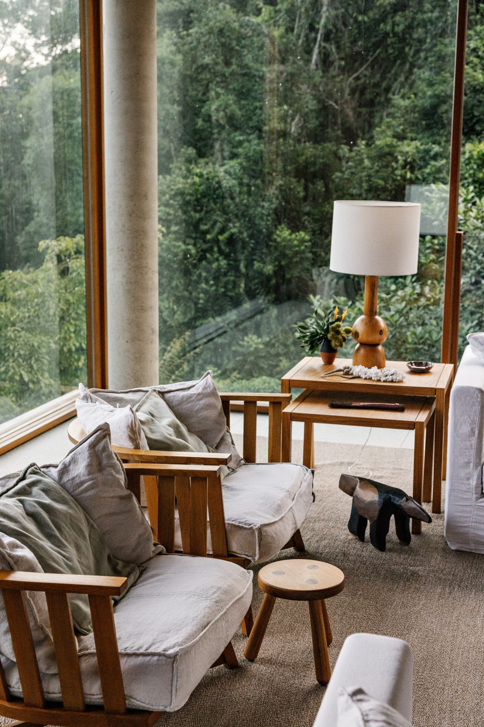 The lower floors contain private sleeping areas, surrounded through openings by the plants outside; meanwhile, the upper floors hold the social spaces, which look out to the treetops and coastal landscape.